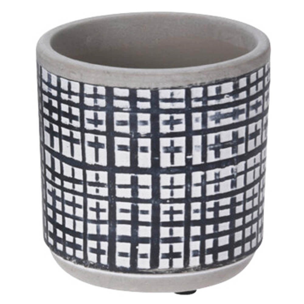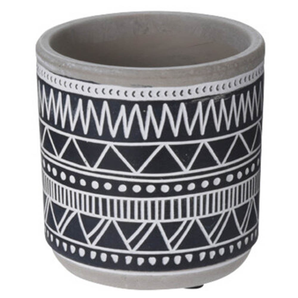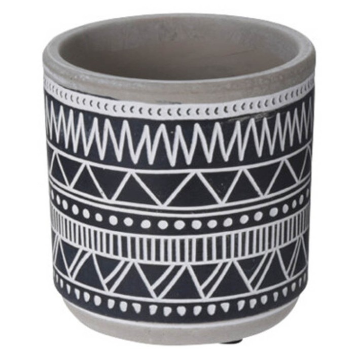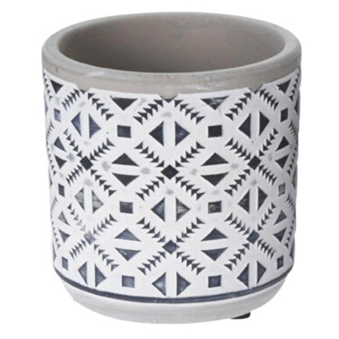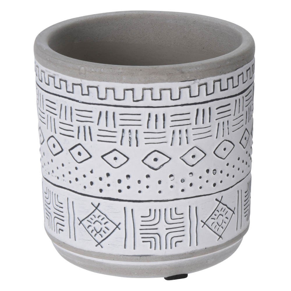 Macetero decorativo fabricado en cerámica con dibujos geométricos de estilo étnico en relieve, perfecto para contener una planta y darle un aire nuevo.