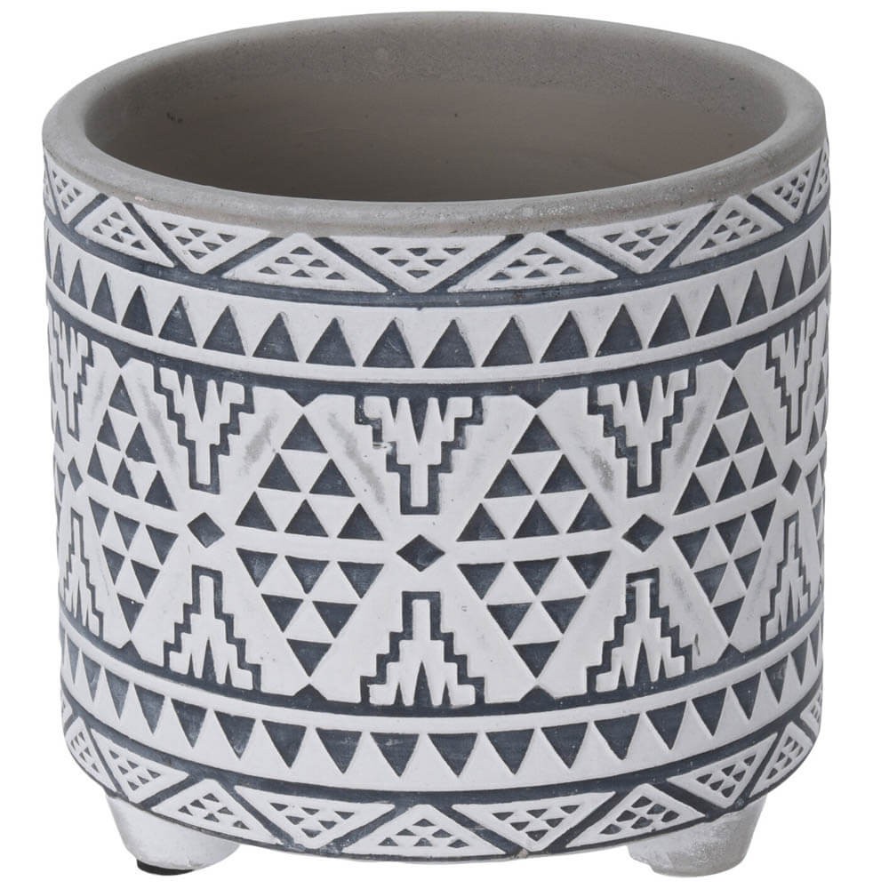 Macetero decorativo fabricado en cerámica con dibujos geométricos de estilo étnico en relieve, perfecto para contener una planta y darle un aire nuevo.