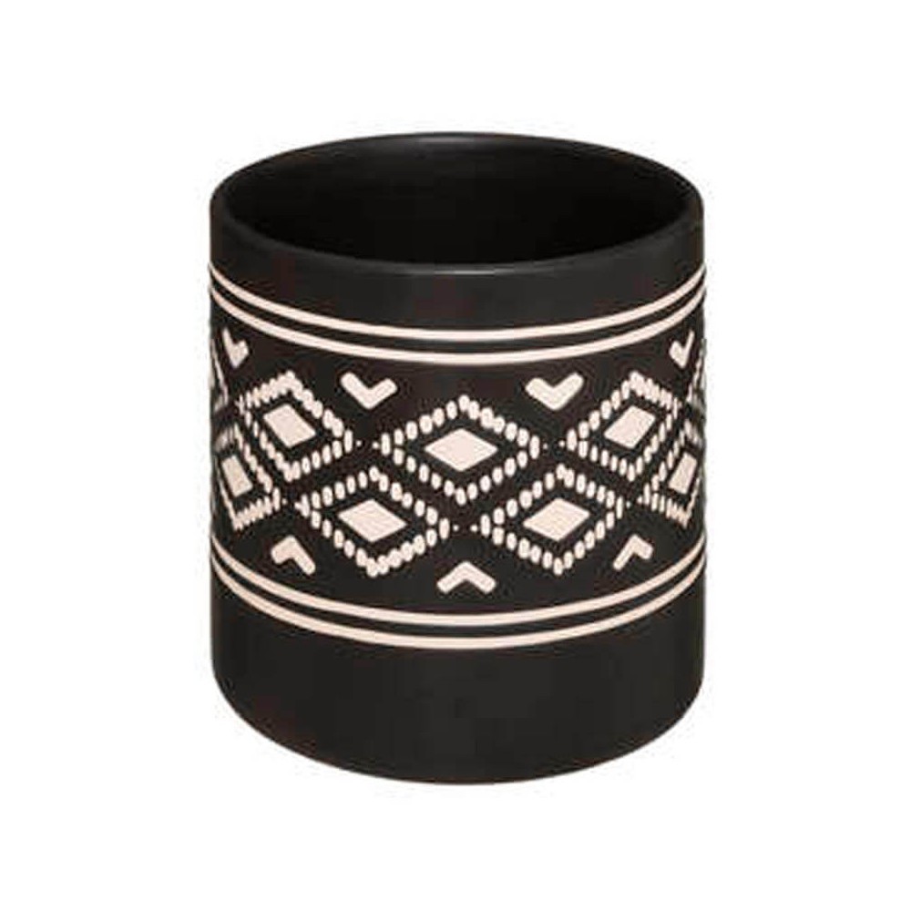 Macetero de estilo étnico fabricado en cerámica de color negro con motivos blancos, ideal para embellecer y dar un aire nuevo a las flores y plantas.