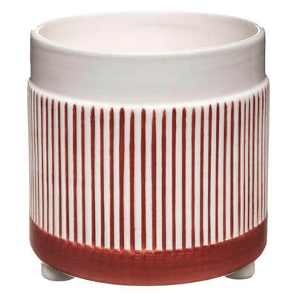 Macetero de cerámica blanco con un original diseño acanalado, lleva pintadas rayas verticales y la base en color rojo, azul o mostaza, perfecto para contener, embellecer y dar un aire nuevo a las flores y plantas.