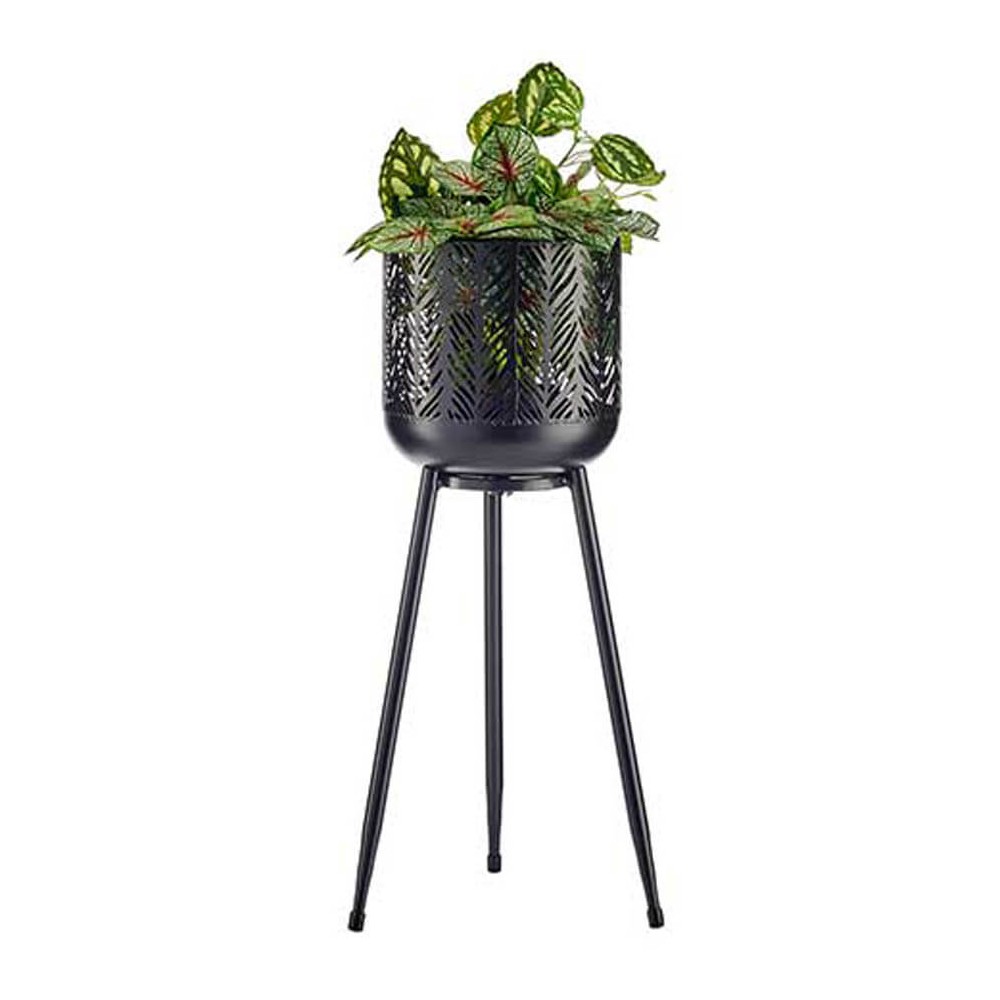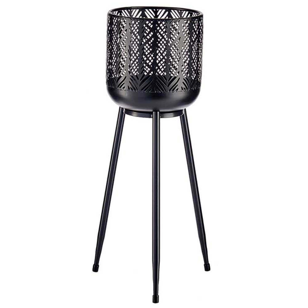 Macetero decorativo formado por una maceta metálica con un dibujo calado en forma de espiga sobre 3 patas cilíndricas de color negro, un accesorio de decoración en tendencia, moderno y minimalista, ideal para embellecer y dar altura a una planta.