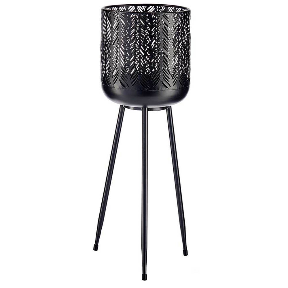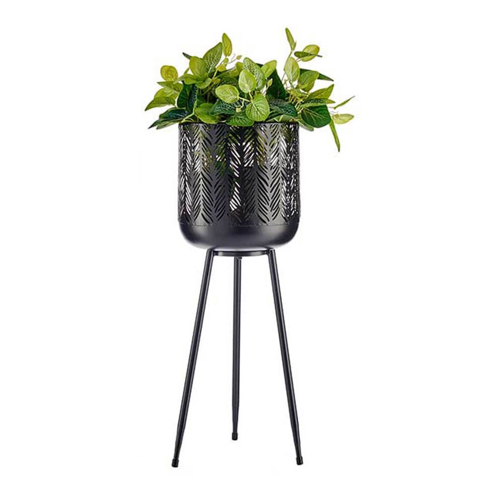 Macetero decorativo formado por una maceta metálica con un dibujo calado en forma de espiga sobre 3 patas cilíndricas de color negro, un accesorio de decoración en tendencia, moderno y minimalista, ideal para embellecer y dar altura a una planta.