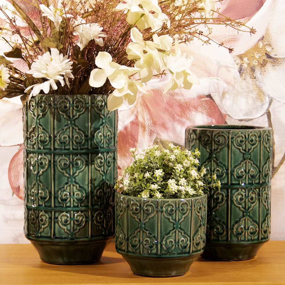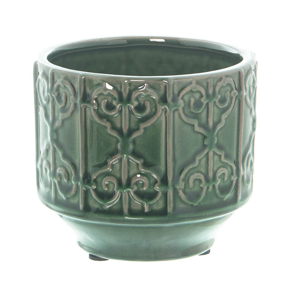 Macetero decorativo redondo realizado en cerámica esmaltada de color verde acabado craquelado con un bonito diseño en relieve, perfecto para contener, embellecer y dar un aire nuevo a las plantas y flores.