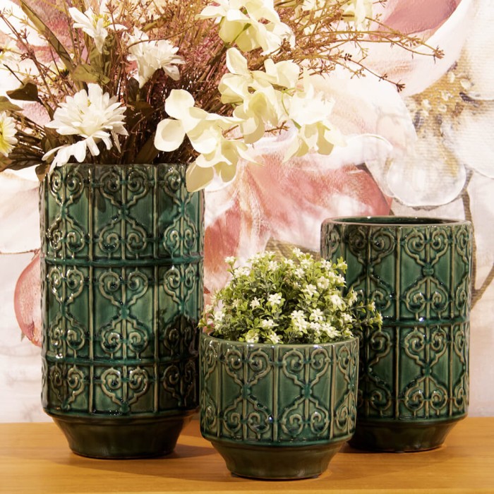Maceta de cerámica esmaltada en color verde diseño relieve, ideal para contener y embellecer una planta.