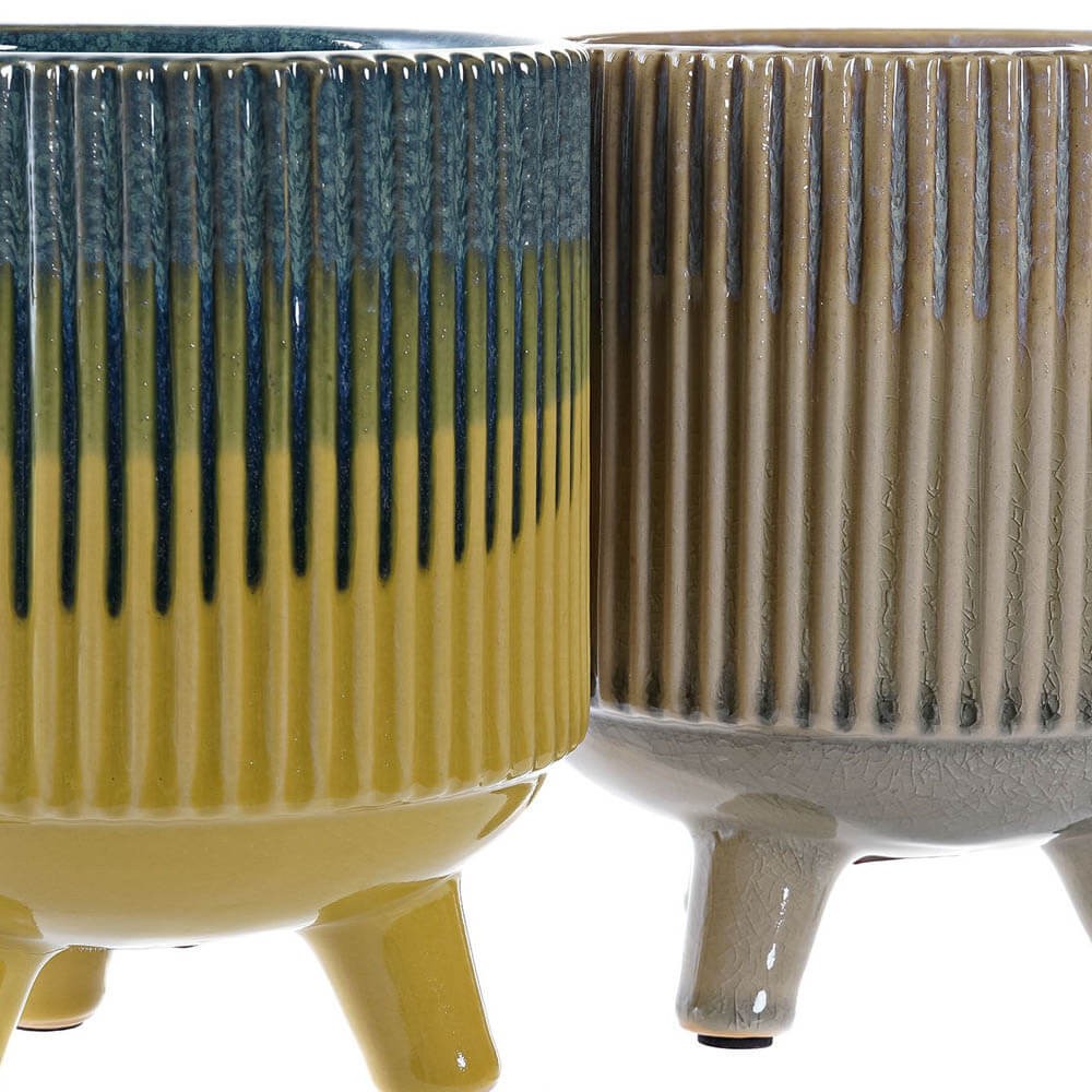 Macetero decorativo con tres patitas realizado en cerámica gres esmaltada con un original diseño acanalado bicolor en formato redondo, perfecto para contener, embellecer y dar un aire nuevo a una planta.