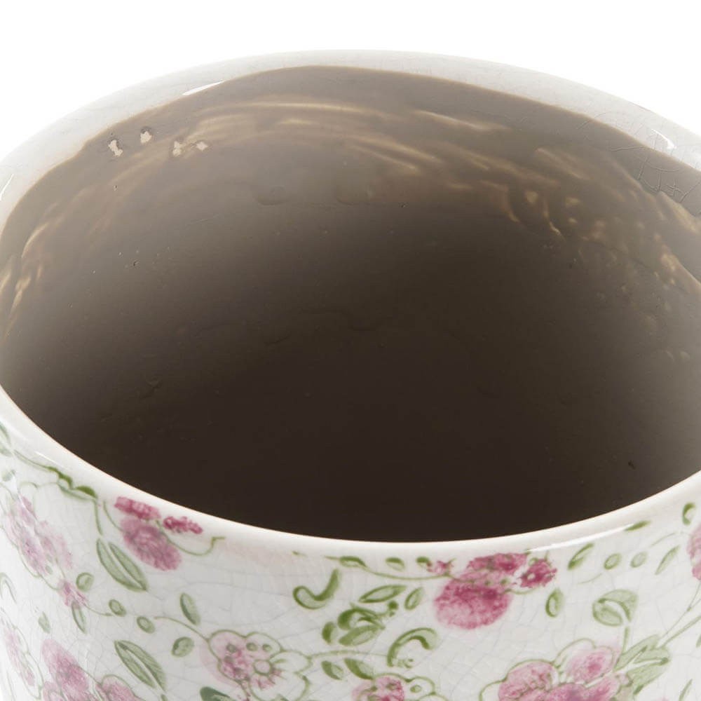 Maceta de cerámica acabado craquelado con un romántico diseño floral en formato cónico, ideal para contener y embellecer una planta.