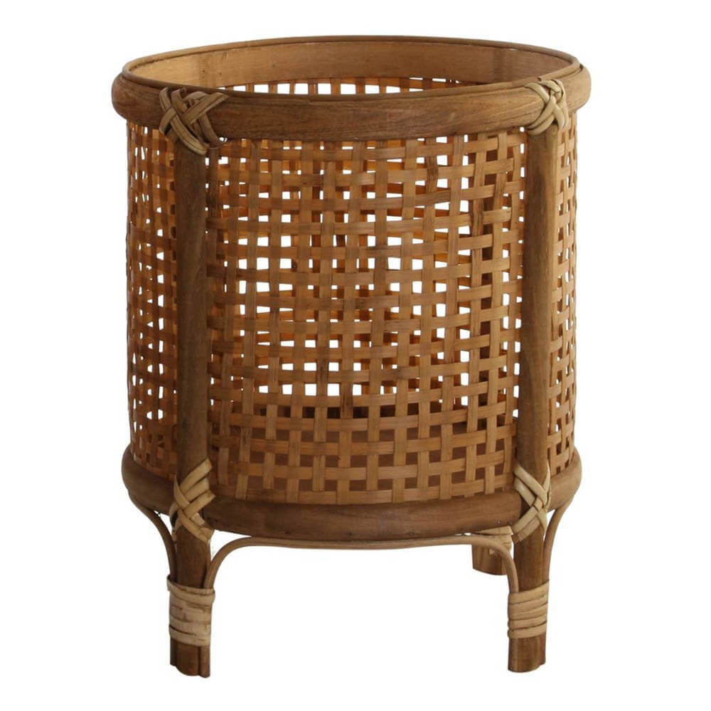 Cubre macetas de bambú acabado natural en formato redondo con cuatro patas fijas, perfecto para contener y embellecer una planta.