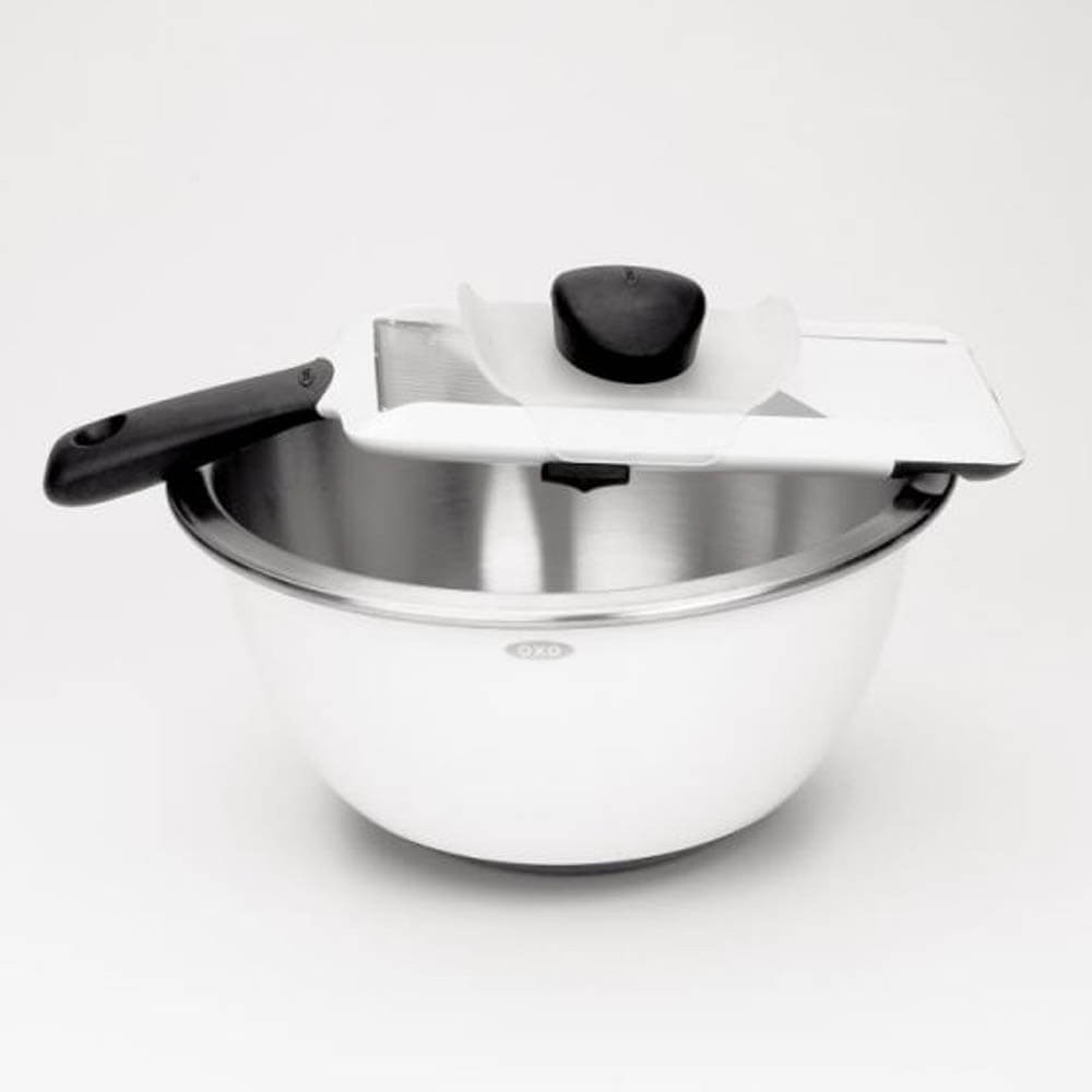 Mandolina de cocina de la marca OXO con cuchillas de acero inoxidable, perfecta para realizar recetas de cocina ahorrando tiempo de preparación. Permite seleccionar hasta 3 grosores de laminado.