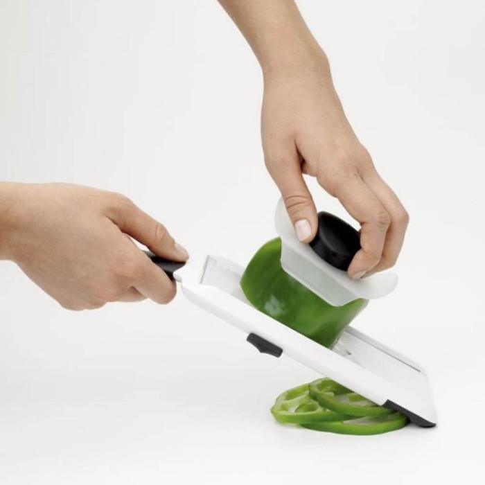 Mandolina de cocina de la marca OXO con 3 grosores de laminado.