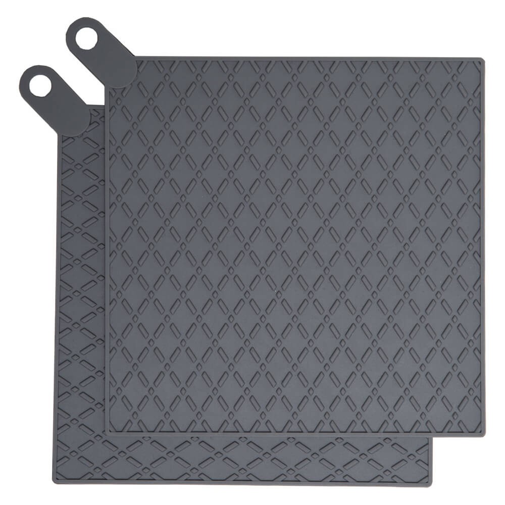 Juego de dos agarradores de cocina en formato cuadrado y plano fabricados en silicona resistente, muy prácticos para sacar y agarrar todo tipo de menaje caliente, platos, fuentes, jarras y mucho más.