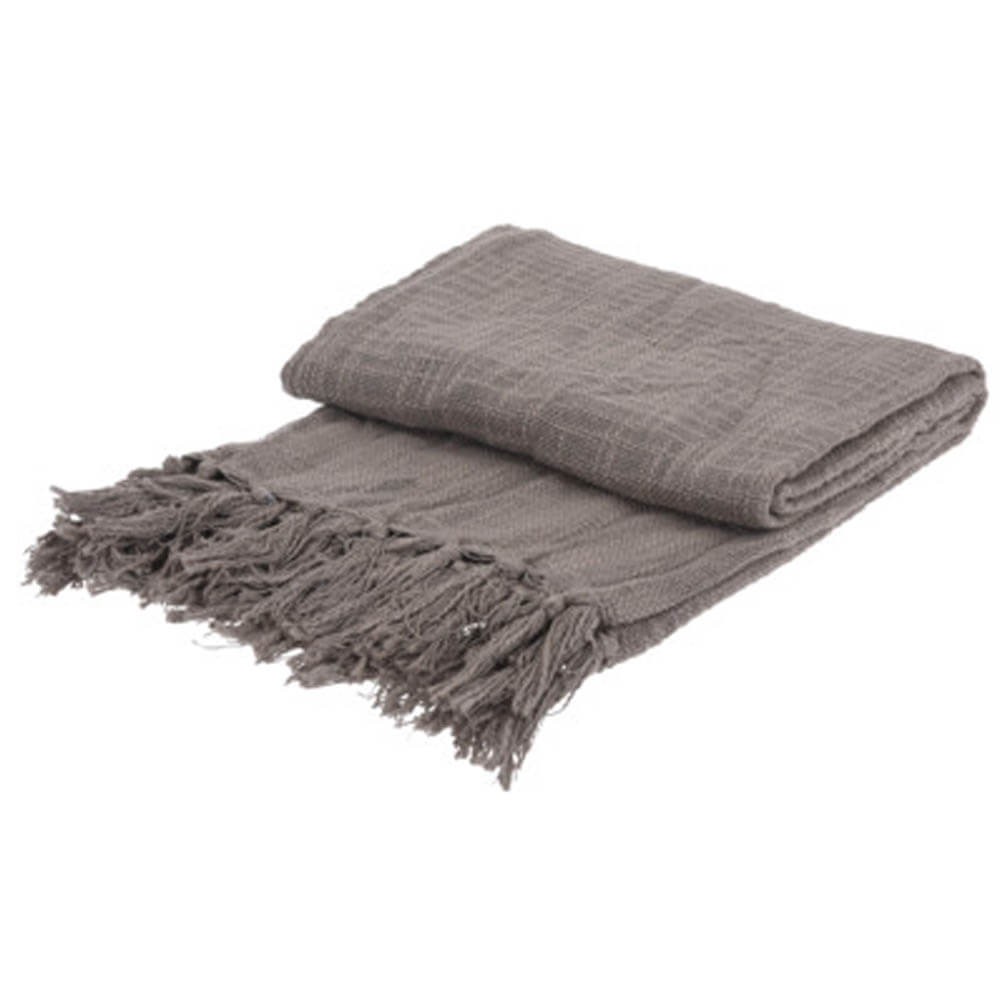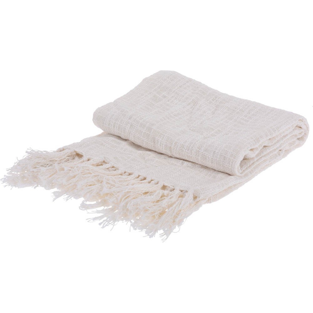 Plaid multiusos confeccionado en tejido de algodón 100% con flecos decorativos, ideal como manta fina para acurrucarse en el sofá o como cubrecama.