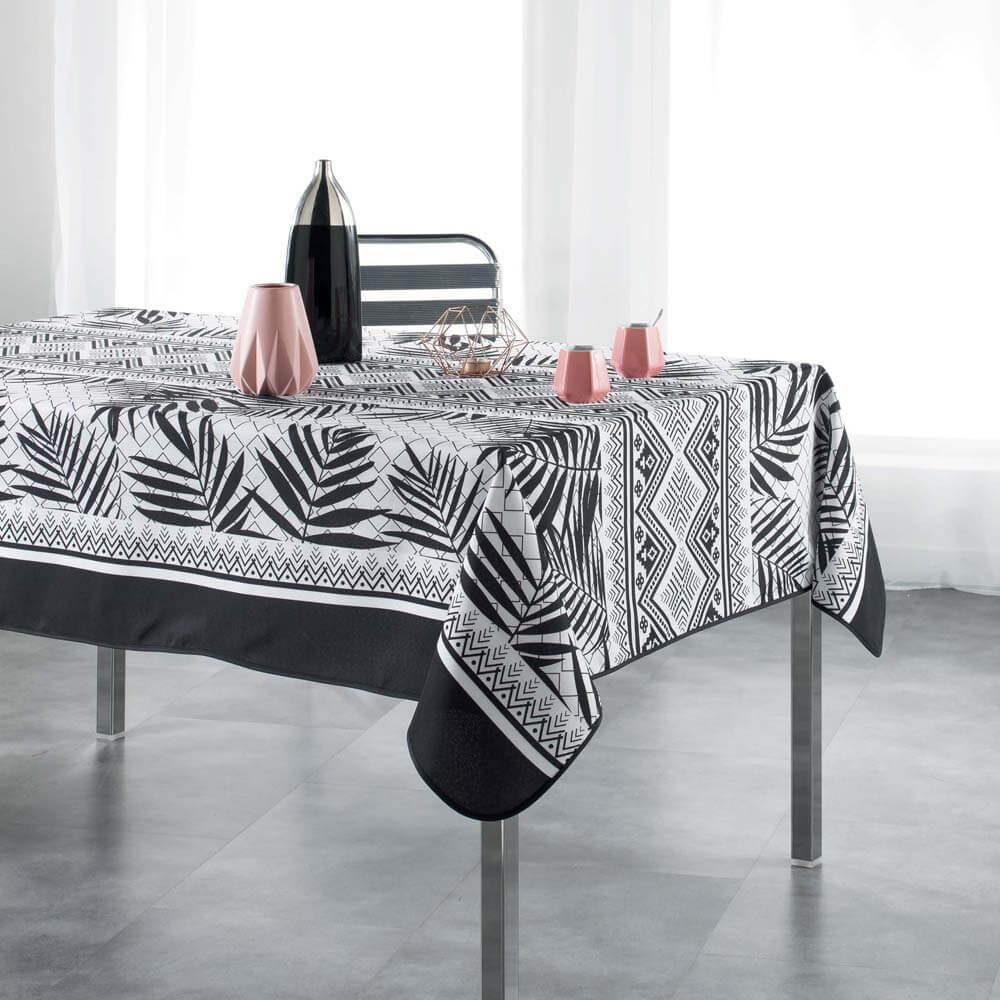 Un mantel antimanchas estampado con dibujos geométricos y hojas tropicales, diseño moderno en blanco y negro, ideal para dar un toque especial a la mesa.