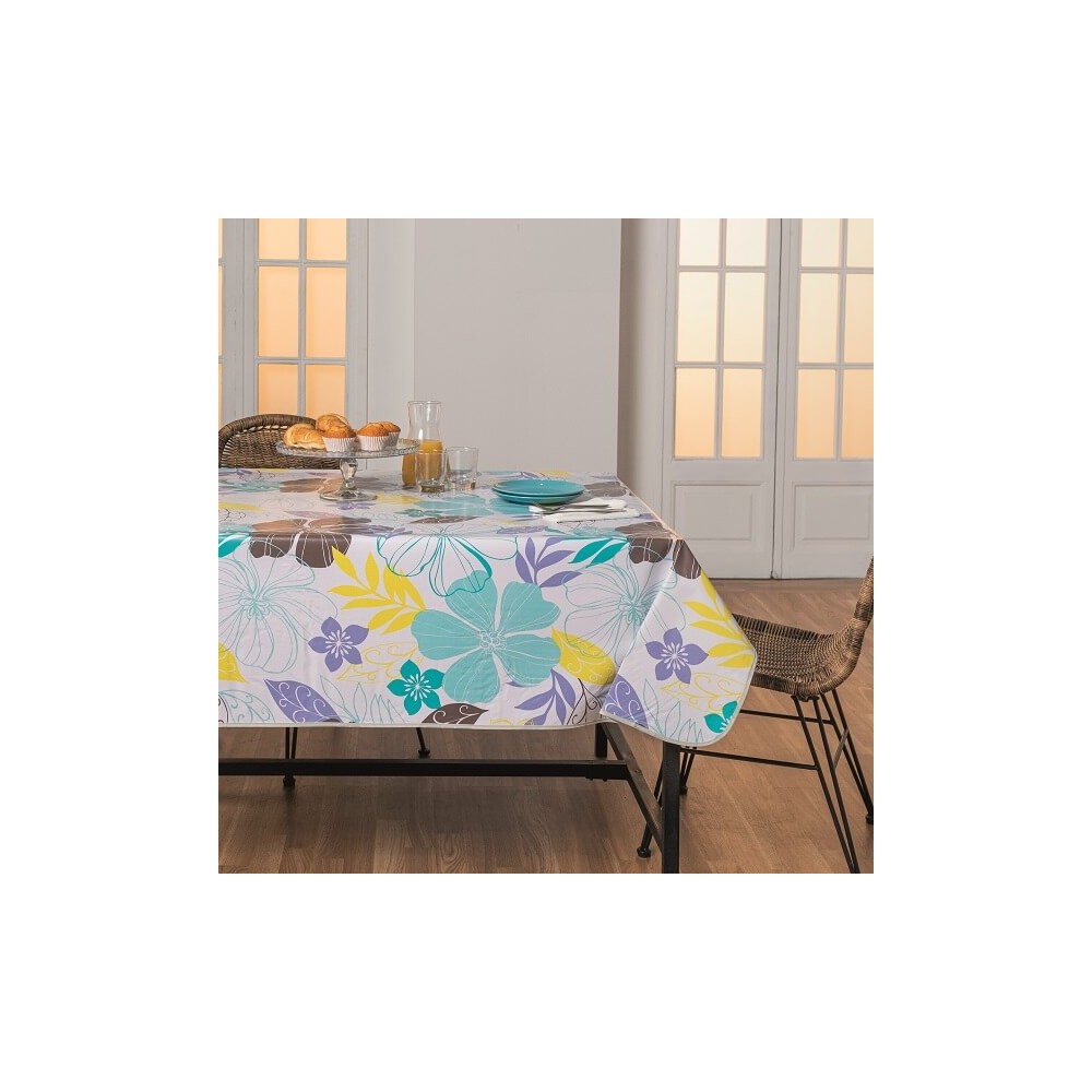 Mantel hule resistente e impermeable confeccionado en tejido plastificado con una lámina de PVC con acabado brillante y previamente estampado a una cara con un llamativo diseño floral en color lila, azul y amarillo, perfecto para proteger las mesas de manchas y arañazos.