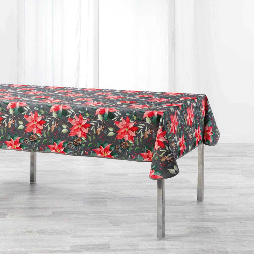 Mantel antimanchas rectangular diseño flores de pascua en color gris.