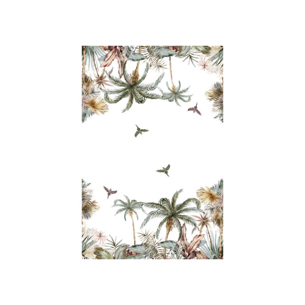Mantel antimanchas confeccionado en tejido de poliéster estampado a una cara a todo color, diseño de estilo tropical decorado con palmeras y loros sobre fondo blanco, perfecto para proteger tu mesa en los desayunos y las meriendas.