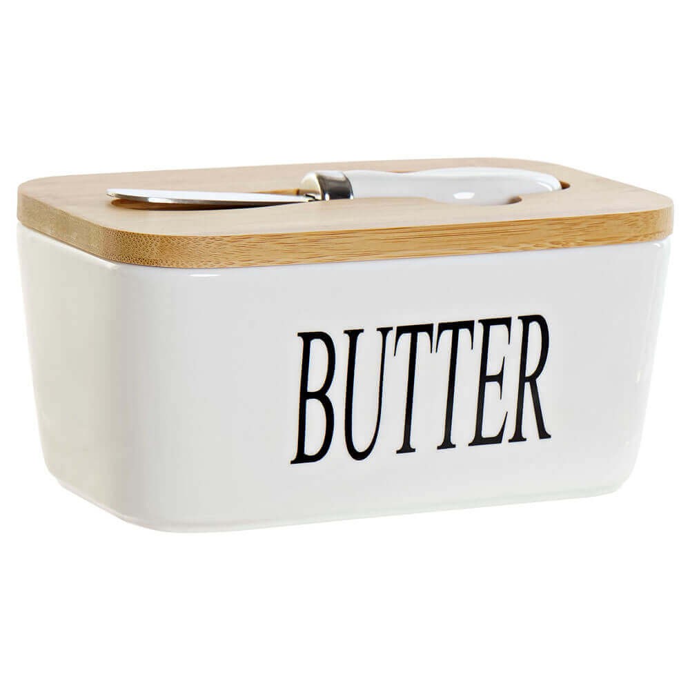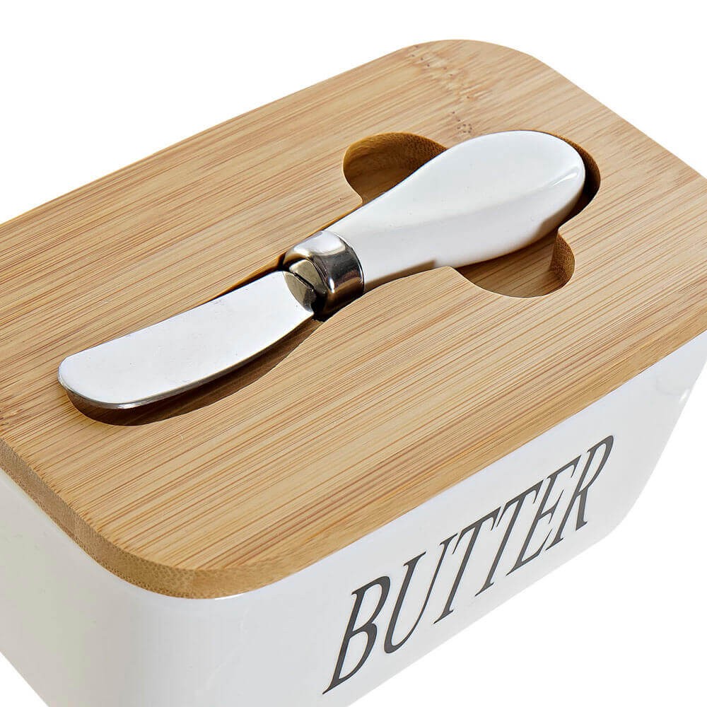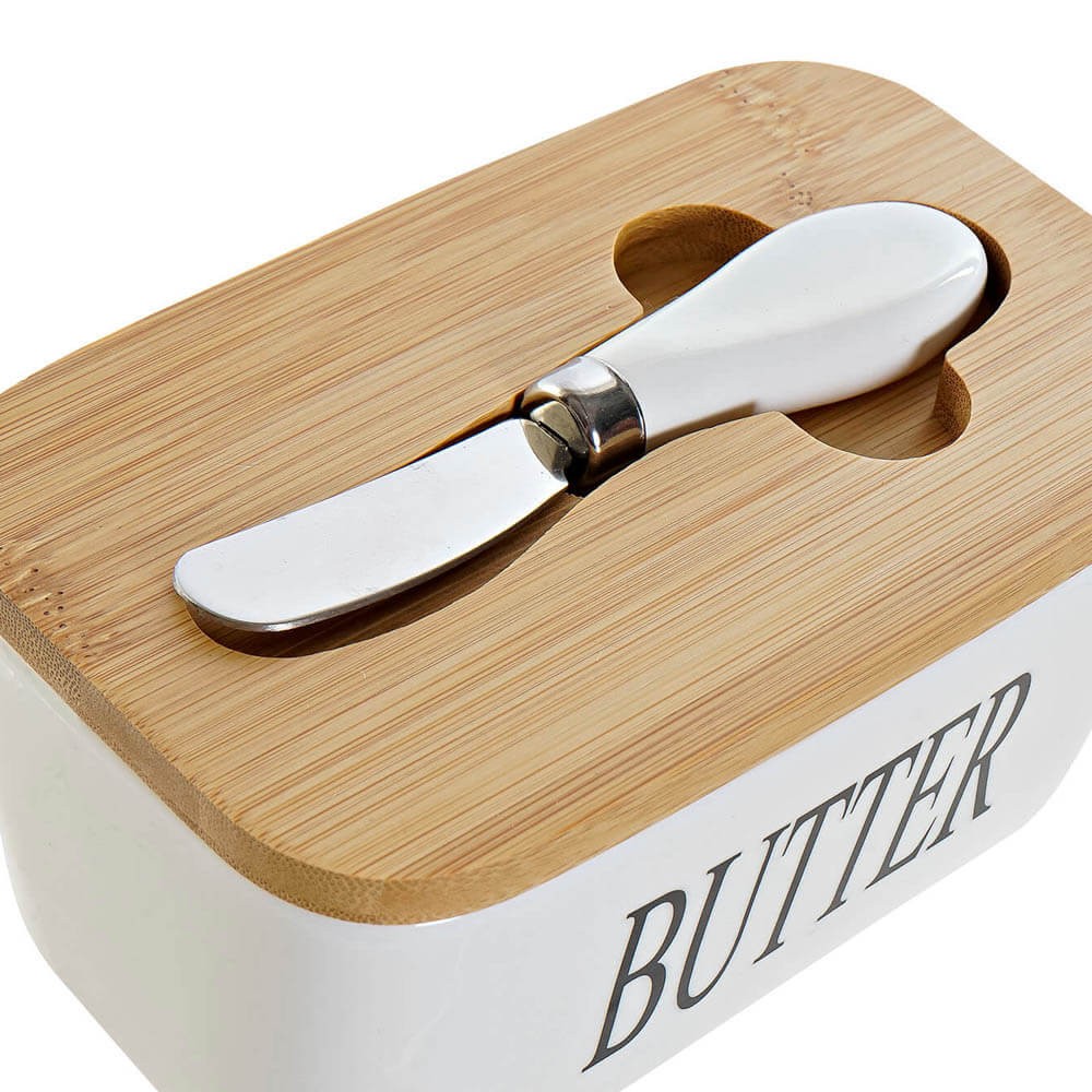Recipiente para guardar la mantequilla realizado en porcelana de alta calidad en color blanco con el frontal decorado con la palabra BUTTER, mantequilla en ingles, en una caligrafía moderna en color negro, lleva una práctica tapa de bambú para mantener la mantequilla fresca y limpia con hendidura en la superficie para colocar el cuchillo con hoja de acero y mango de cerámica, incluido en el set.
