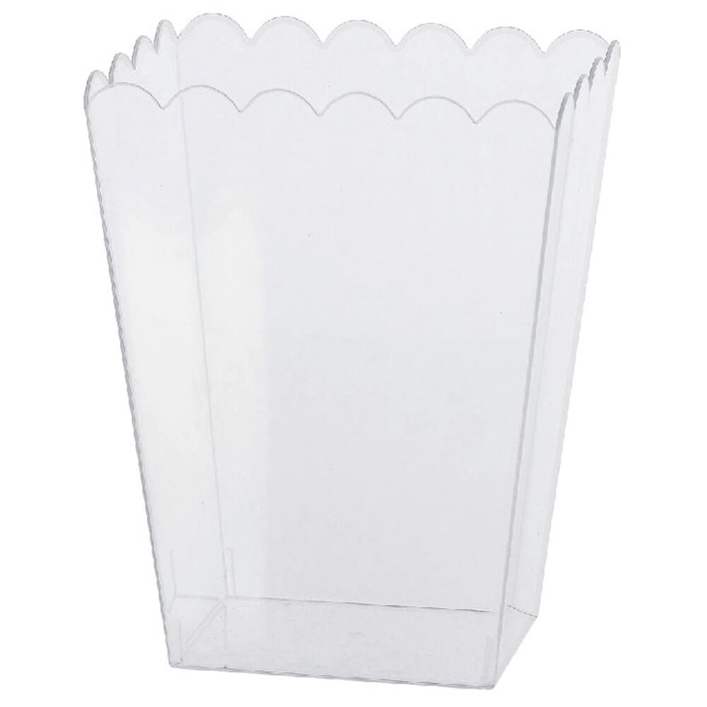 Contenedor para caramelos, chucherías, cake pops y mucho más fabricado en plástico transparente, diseño inspirado en las cajas de palomitas de cartón con el borde festoneado. Un accesorio ideal para montar mesas dulces en fiestas y eventos.
