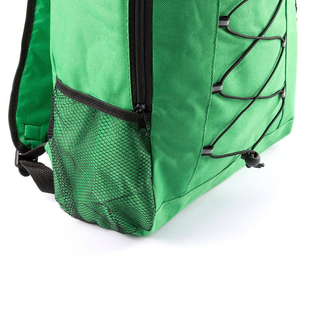 La mochila esta fabricada en tejido resistente de poliéster 600D en color azul con espalda acolchada para que la carga se sienta más cómoda y ligera, lleva cierre de cremallera, salida para auriculares, cuerda elástica en frontal con soportes reflectantes, bolsillos elásticos de redecilla a los lados y cintas de hombros ajustables con acolchado para un máximo confort.