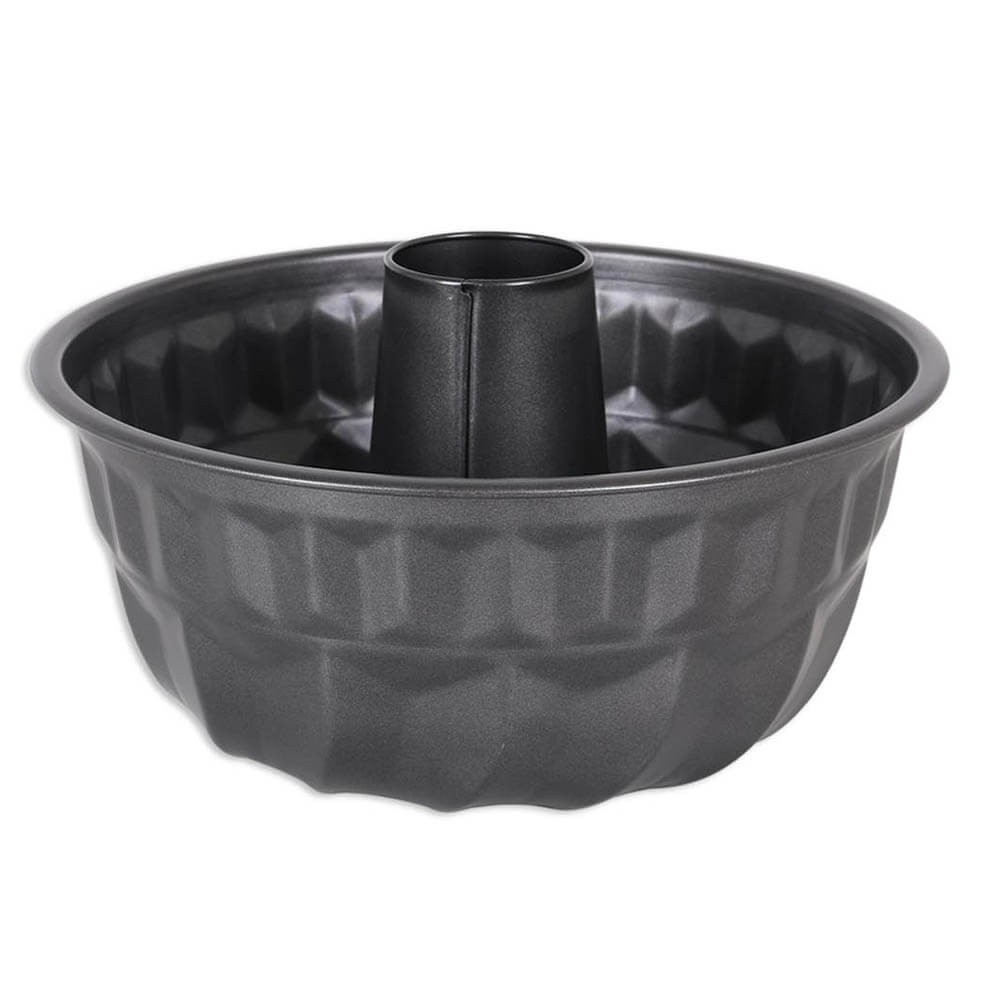 Molde para bizcocho tipo bundt fabricado en aluminio con revestimiento antiadherente para un desmoldado fácil. El molde de horno tiene un atractivo diseño en forma de anillo con la superficie ondulada.