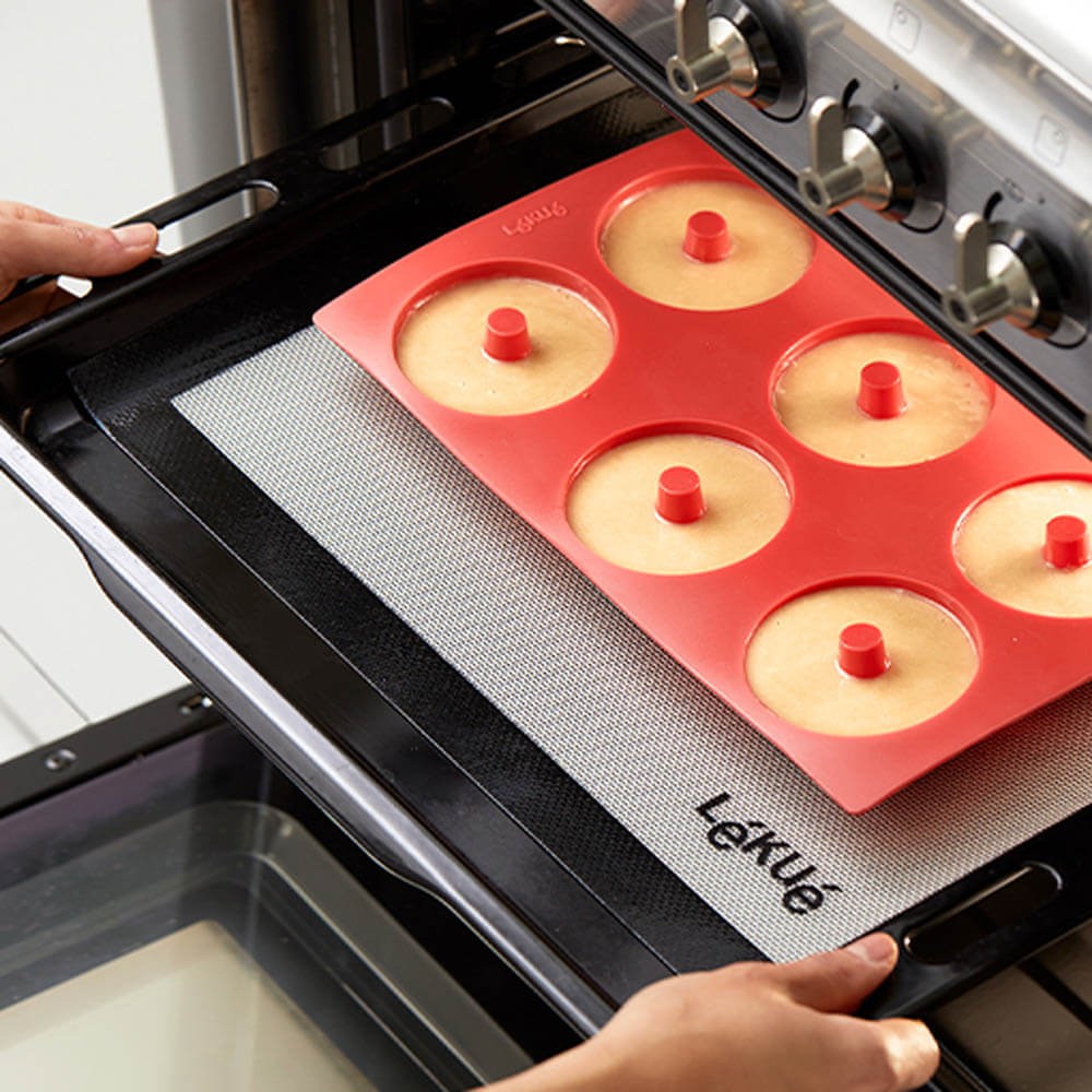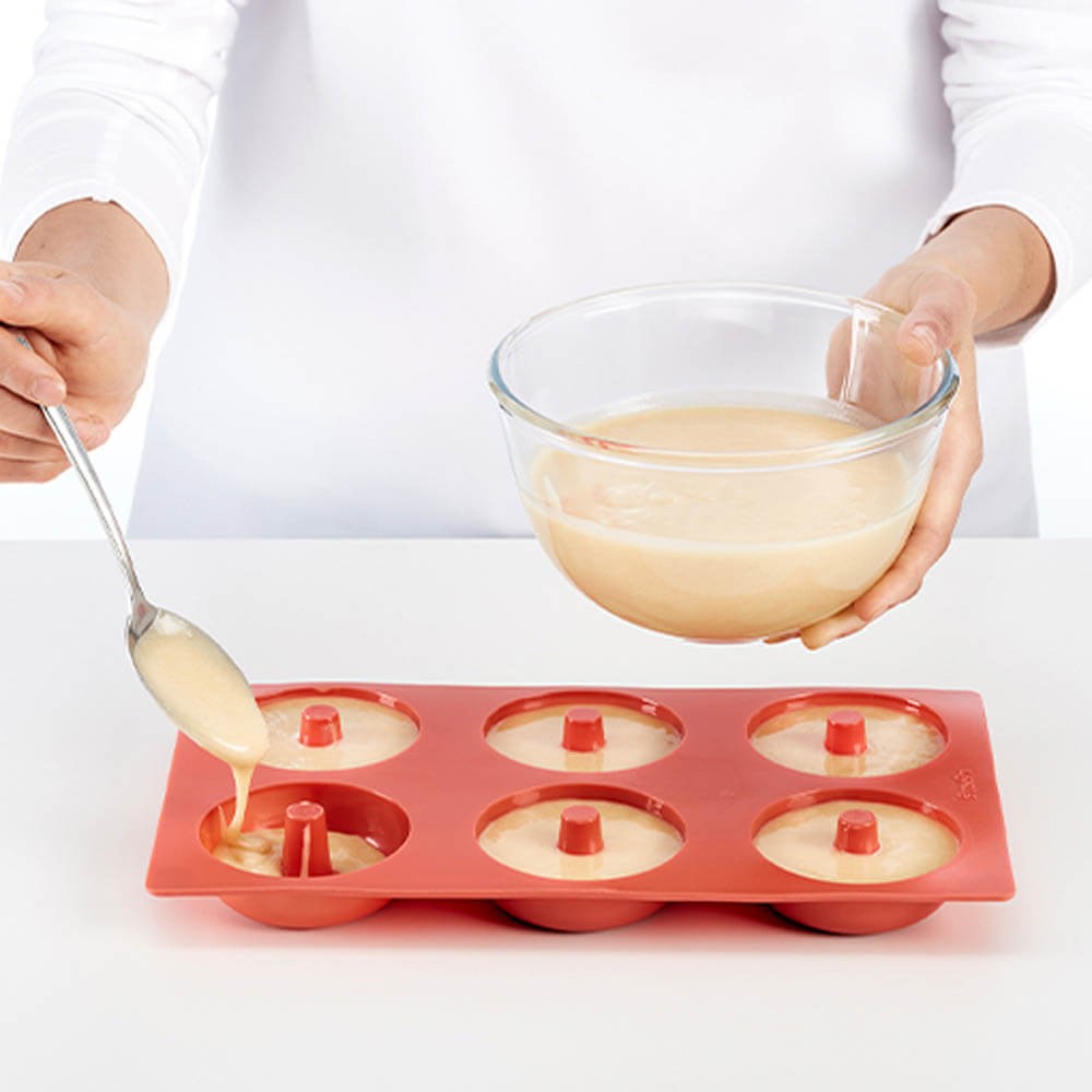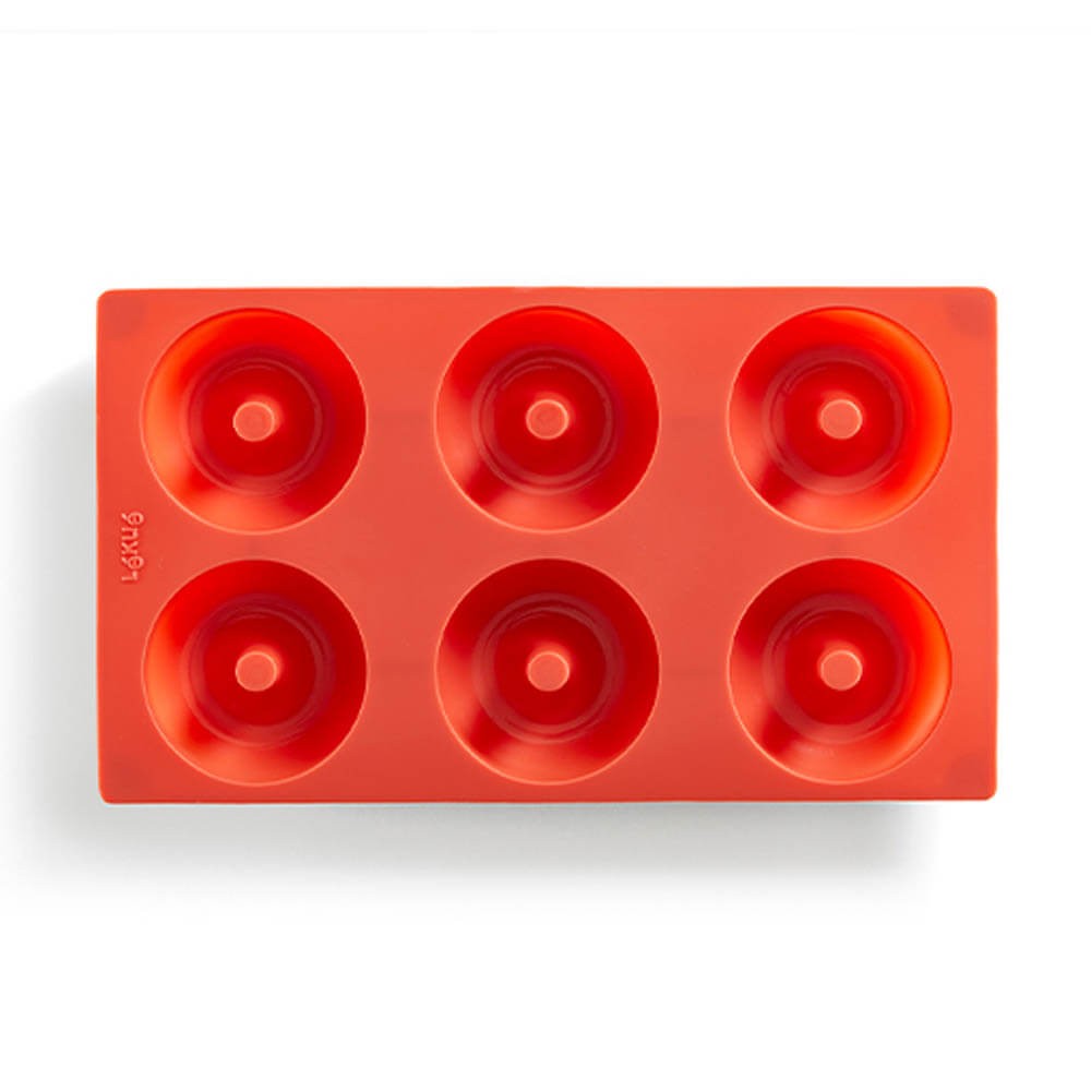 Molde para donuts de la marca Lékue fabricado en silicona platino, Apto para horno, microondas y congelador.
