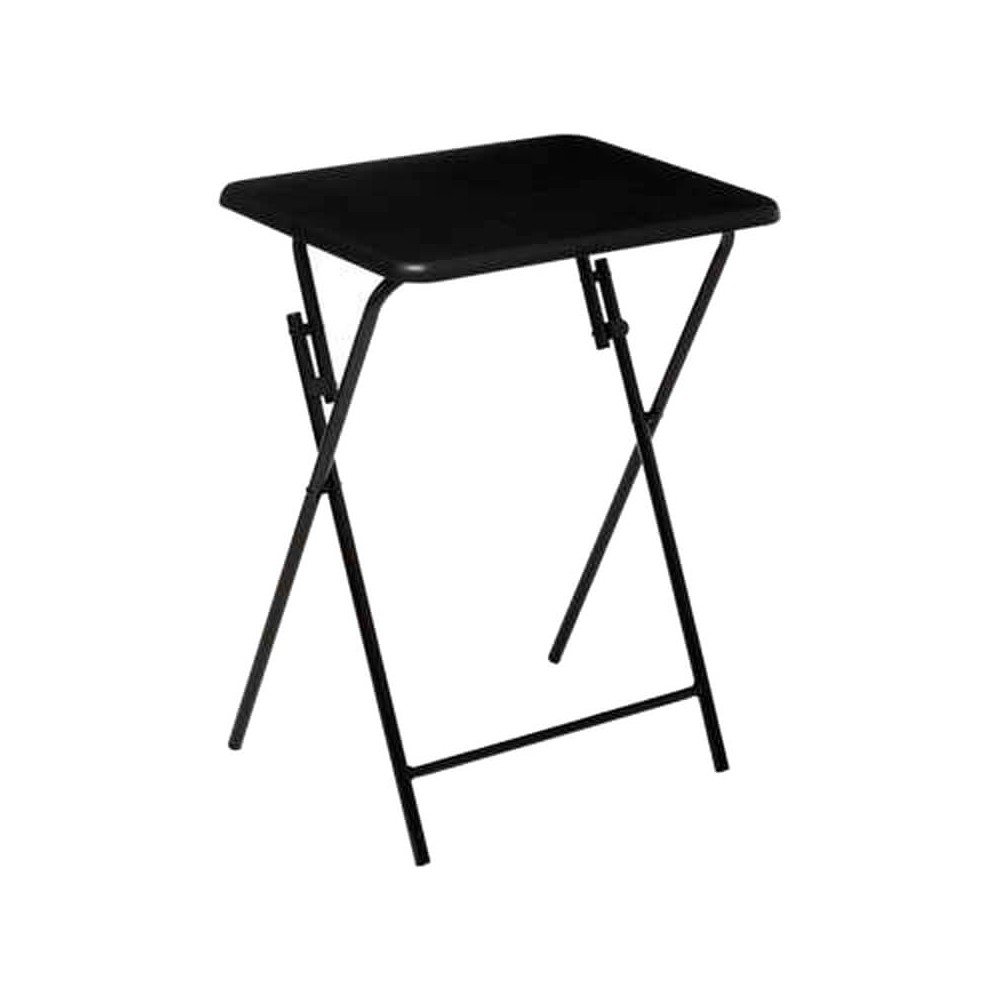 Mesa auxiliar plegable con tablero rectangular de madera MDF en color negro y patas metálicas en forma de tijera revestidas de pintura negra.