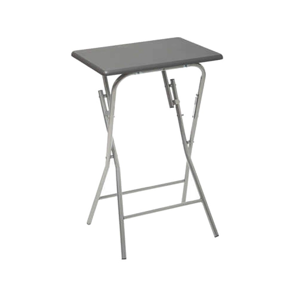 Mesa auxiliar plegable con tablero gris rectangular de madera MDF y patas metálicas en forma de tijera revestidas de pintura plata.