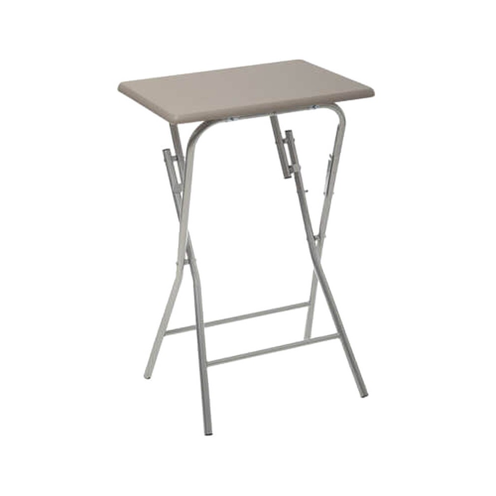 Mesa auxiliar plegable con tablero rectangular de madera MDF en color topo y patas metálicas en forma de tijera revestidas de pintura plata.