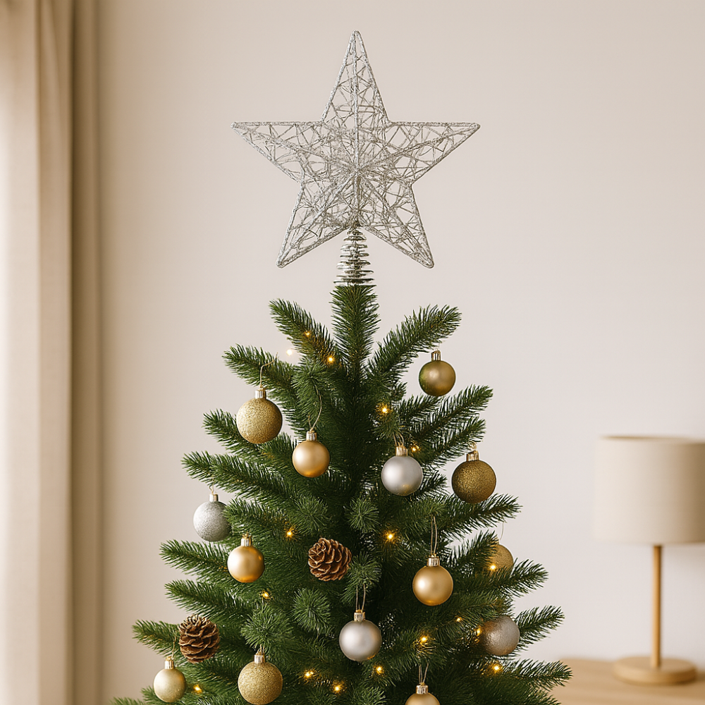 Dale el toque final perfecto a tu árbol con esta estrella metálica de Navidad de 20 cm. Disponible en dos acabados, dorado brillante o plateado elegante, se adapta a cualquier estilo decorativo navideño.