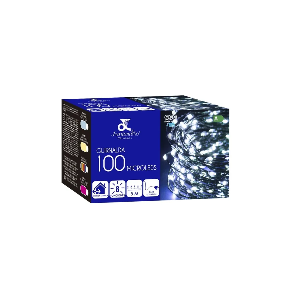 Cadena de 100 microLEDs cálidos 5 m interior y exterior con 8 funciones