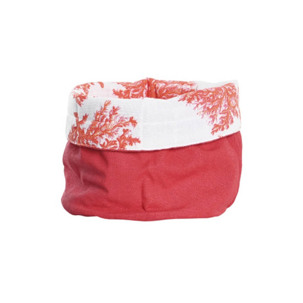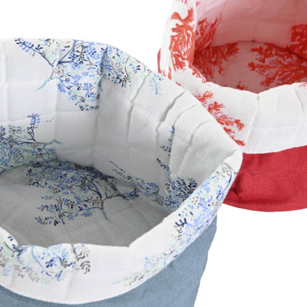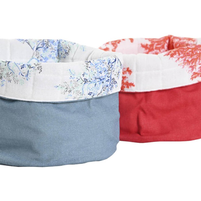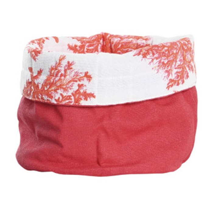 Cesta decorativa y práctica realizada en algodón estampado con un elegante diseño de corales en color rojo o azul para que aportes estilo a la decoración de tu casa. Perfecta como panera o para que organices diferentes objetos. Añade un toque elegante y sofisticado a cualquier habitación de tu hogar y disfruta de la comodidad y funcionalidad de esta hermosa cesta