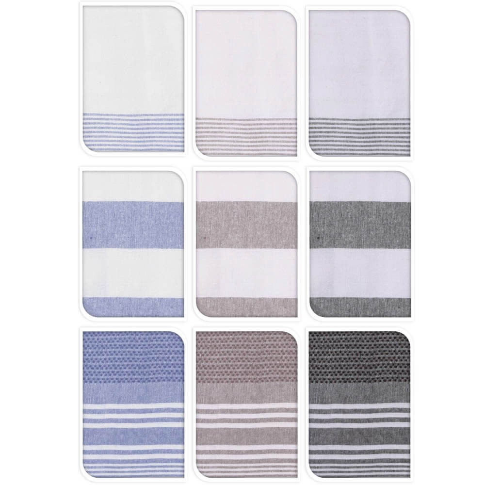 El set de paños de algodón incluye 3 paños con diferentes diseños de rayas, disponibles en color marrón, azul o gris.