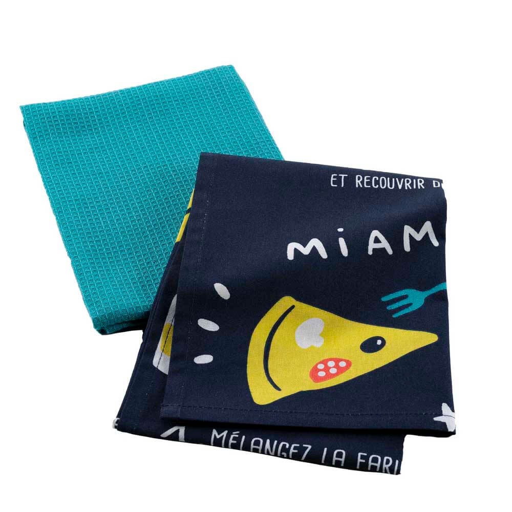 Juego de 2 paños de cocina diseño mini chef confeccionados en tejido resistente de algodón con diferentes texturas. El set incluye un paño azul turquesa de sarga de algodón 100% con efecto gofrado y un paño estampado con un original diseño en francés con la receta de la pizza.