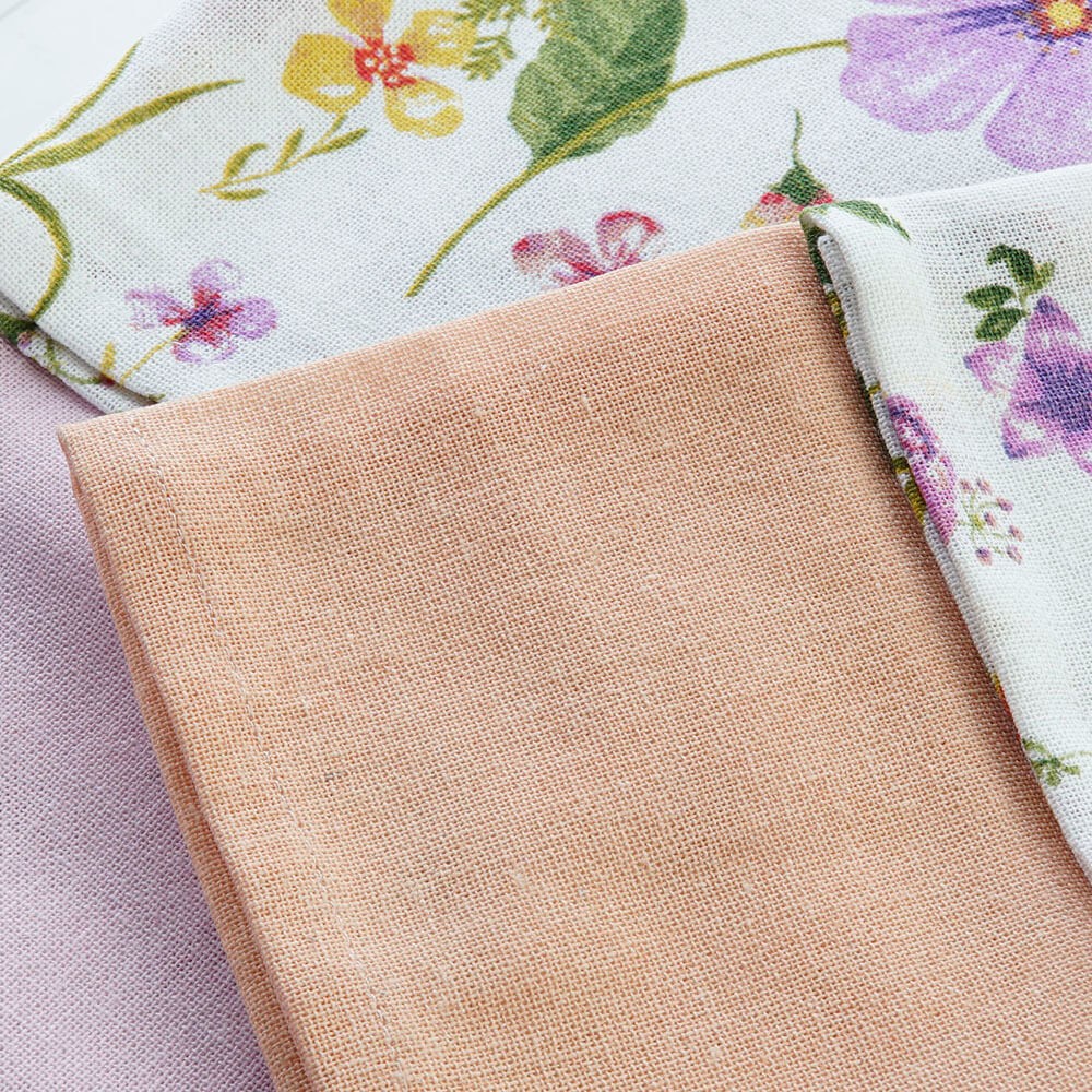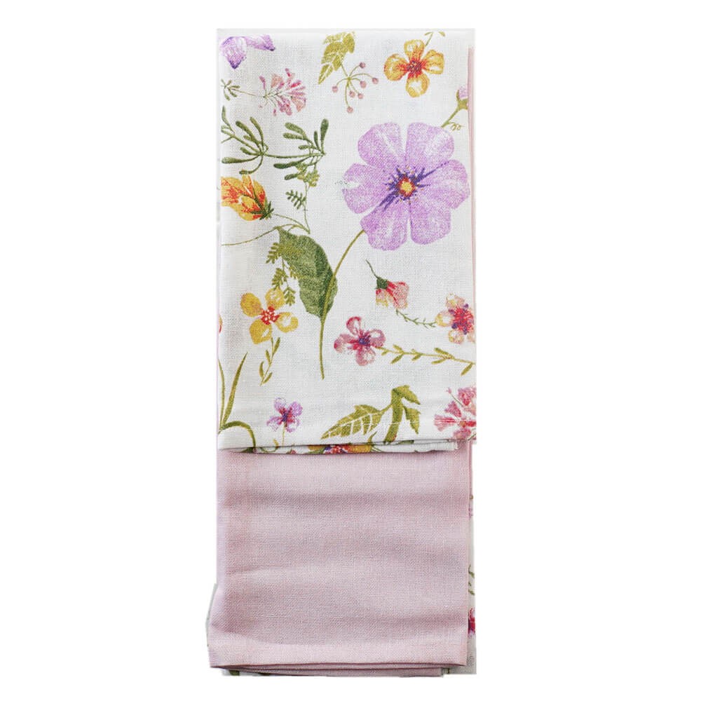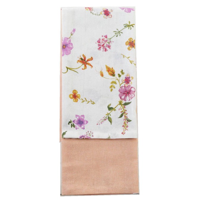 Este set de paños de algodón esta formado por un paño en color sólido lila o melocotón y un paño estampado con flores multicolor, el complemento perfecto para la cocina.