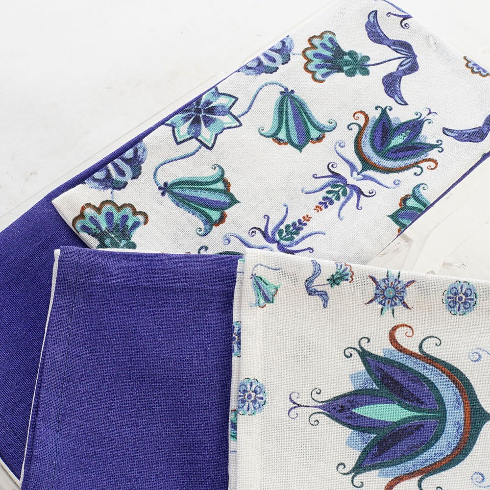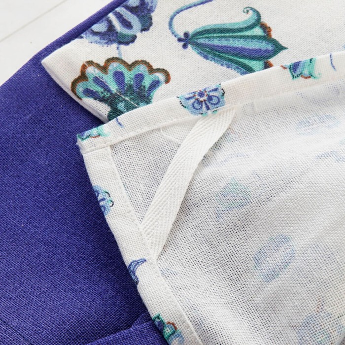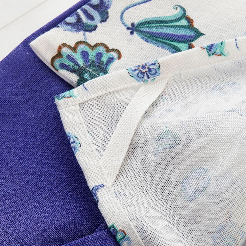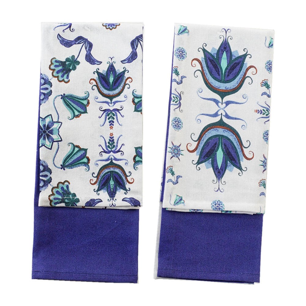Este set de paños de algodón esta formado por un paño en color sólido azul y un paño estampado con motivos florales que recuerdan a los azulejos, el complemento perfecto para la cocina.