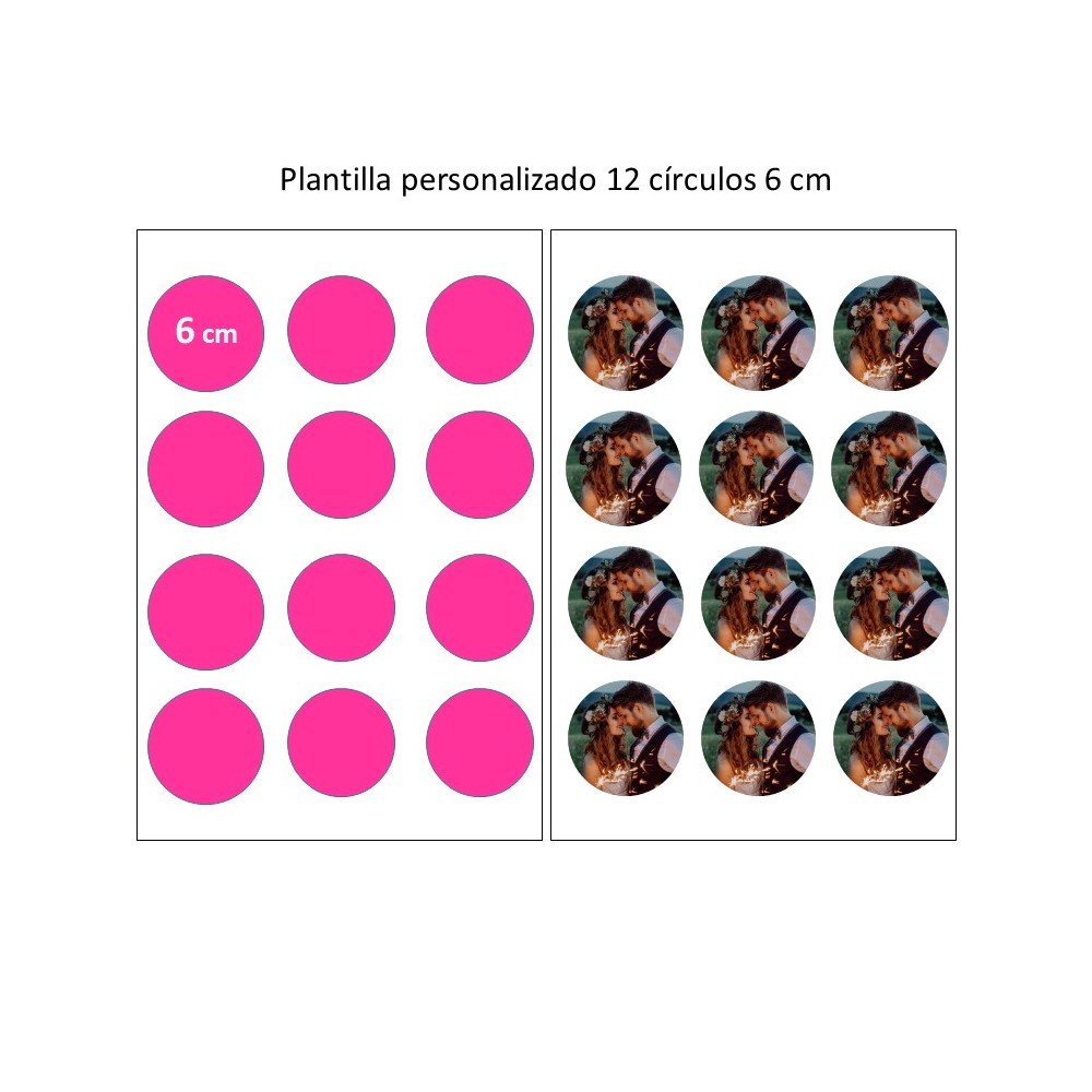 Si te estas preguntado dónde comprar papel de azúcar personalizado estas en el sitio adecuado, somos especialistas en el sector. Adjunta más abajo la imagen que deseas imprimir y te imprimiremos un folio de papel de azúcar comestible tamaño A4 con 12 círculos de 6 cm de diámetro.
