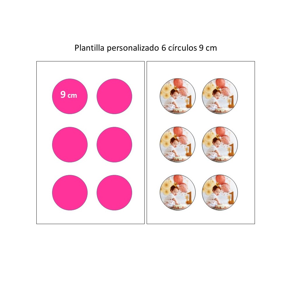 Si te estas preguntado dónde comprar papel de azúcar personalizado estas en el sitio adecuado, somos especialistas en el sector. Adjunta más abajo la imagen que deseas imprimir y te imprimiremos un folio de papel de azúcar comestible tamaño A4 con 6 círculos de 9 cm de diámetro.
