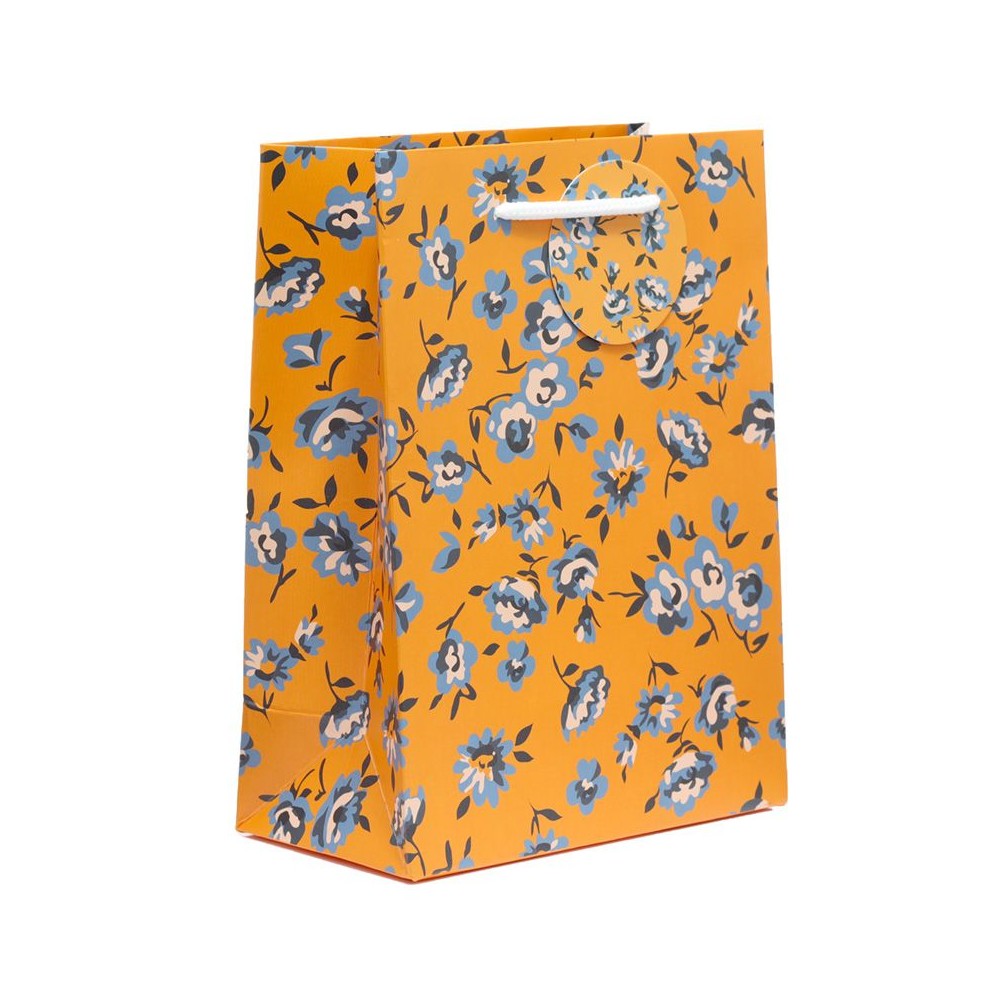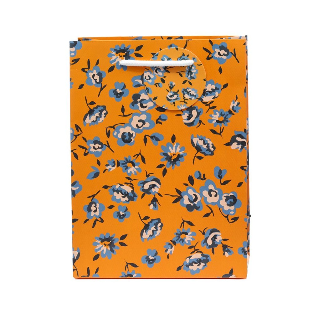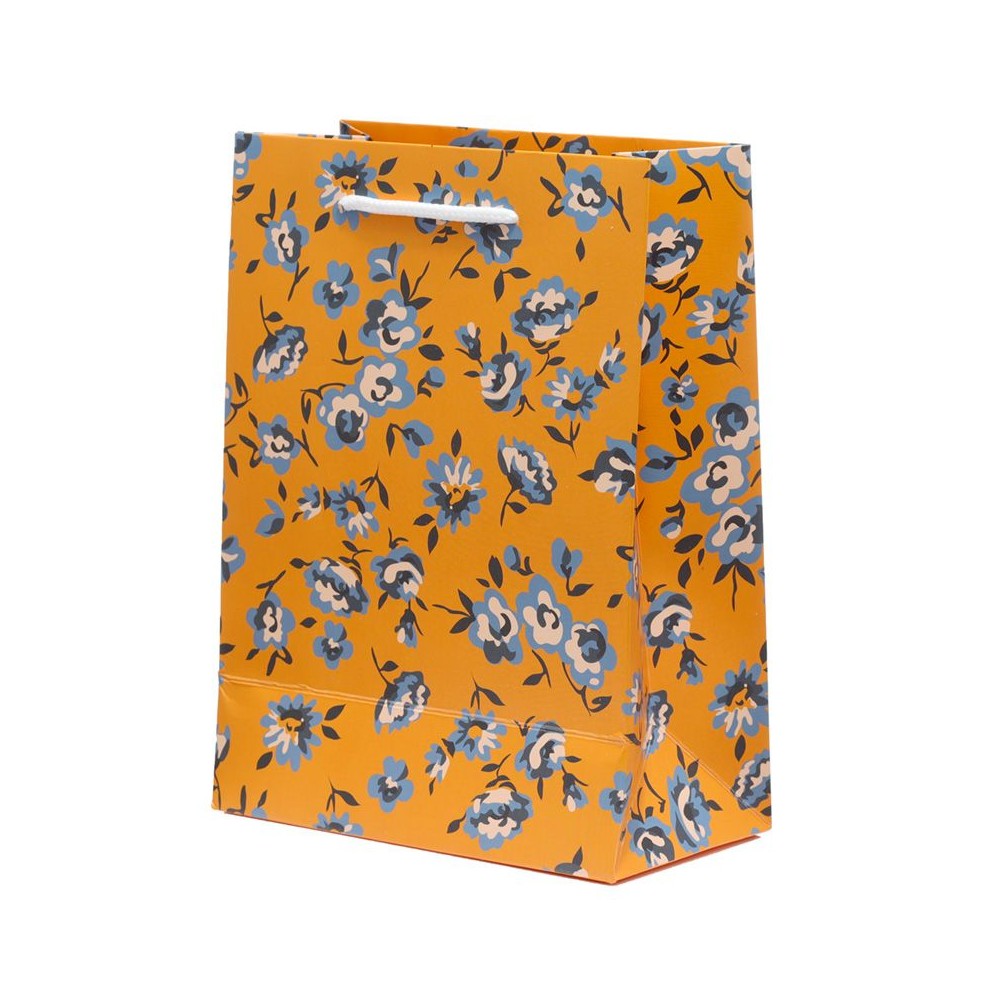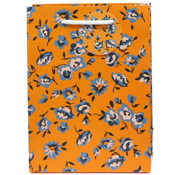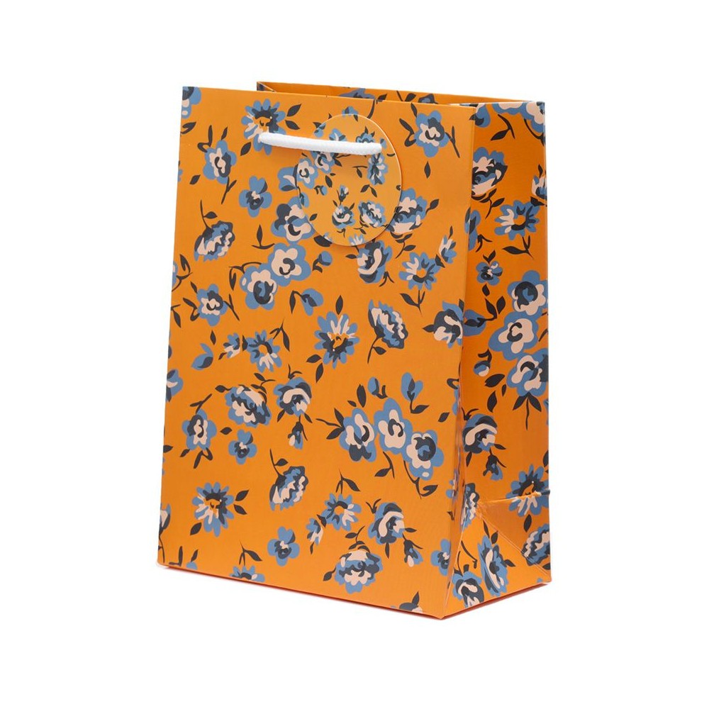 Bolsa de Regalo grande fabricada en papel resistente de alto gramaje con asas de nylon, diseño de estilo ingles con peonías azules sobre fondo naranja. Es igual por las ambas caras.