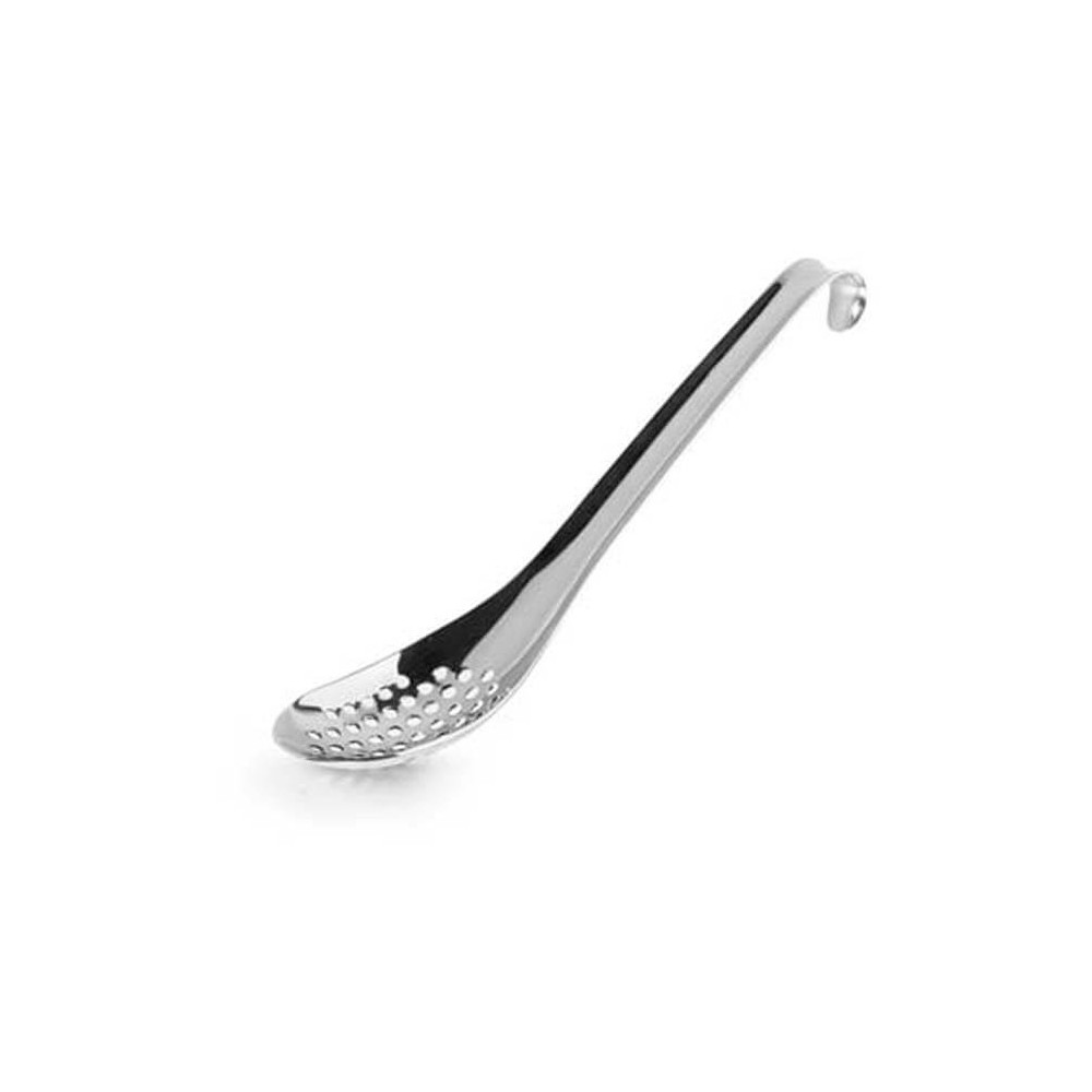 Cuchara para esferificaciones realizada en acero inoxidable con base perforada, perfecta para recoger las bolitas, separar la yema de la clara de huevo, coger caviar, etc.