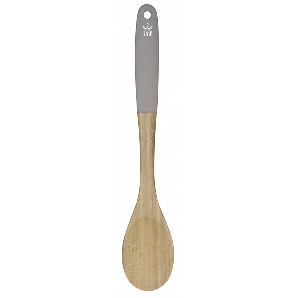 Cuchara de bambú con mango de silicona anti deslizante, ideal para usar con recipientes antiadherentes.