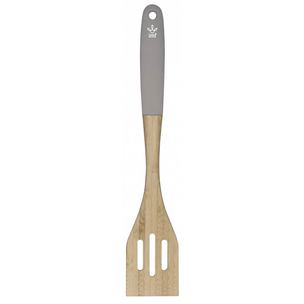 Pala perforada de bambú con mango de silicona anti deslizante, ideal para usar con recipientes antiadherentes.