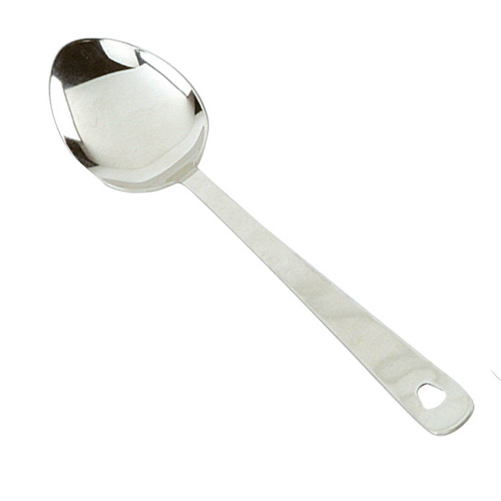 Cuchara de cocina clásica en acero inoxidable con 34 cm de longitud, ideal para servir, remover, mezclar o recoger alimentos. Apta para lavavajillas. El agujero en el mango permite colgarla convenientemente si se desea.