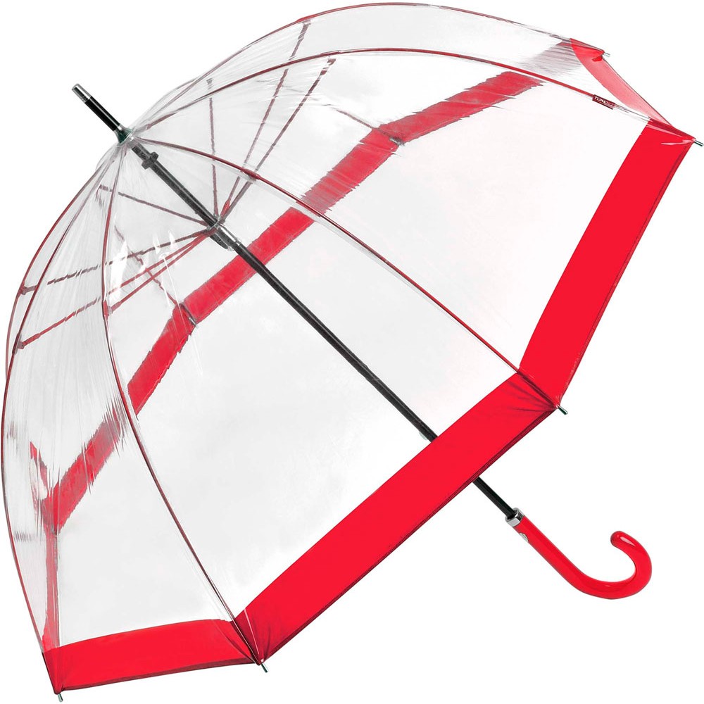 Paraguas transparente con cenefa blanca, roja o negra, lleva 8 varillas y empuñadura a juego.