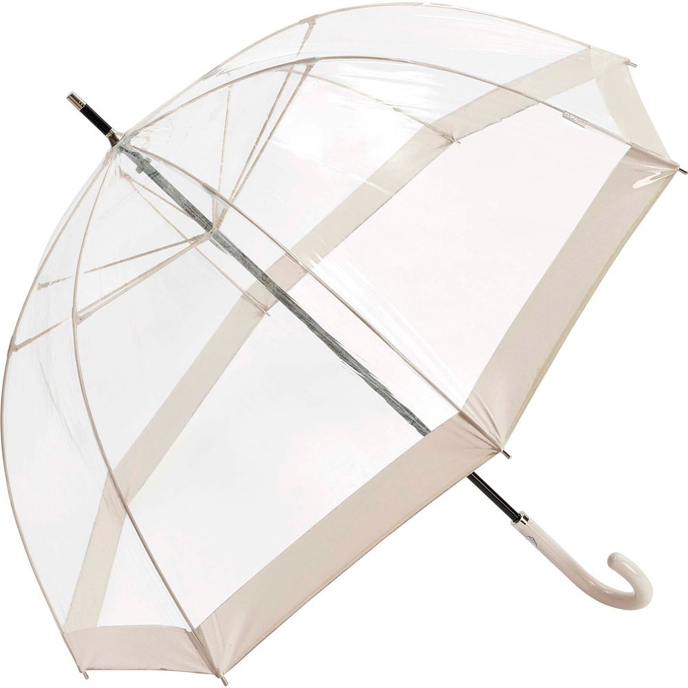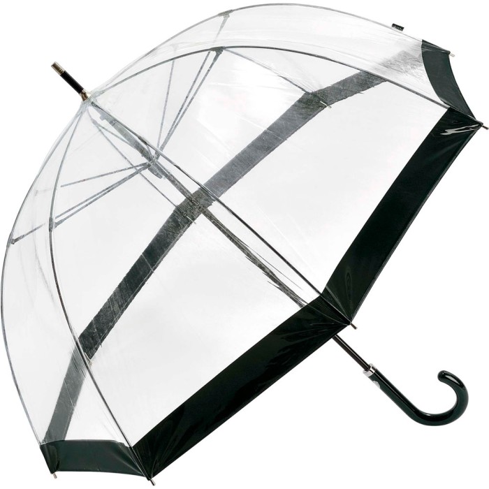 Un paraguas con un diseño sencillo y elegante, lleva la cúpula realizada en vinilo transparente de alta calidad con cenefa de color y 8 varillas de fibra de vidrio y empuñadura cómoda de sostener a juego.