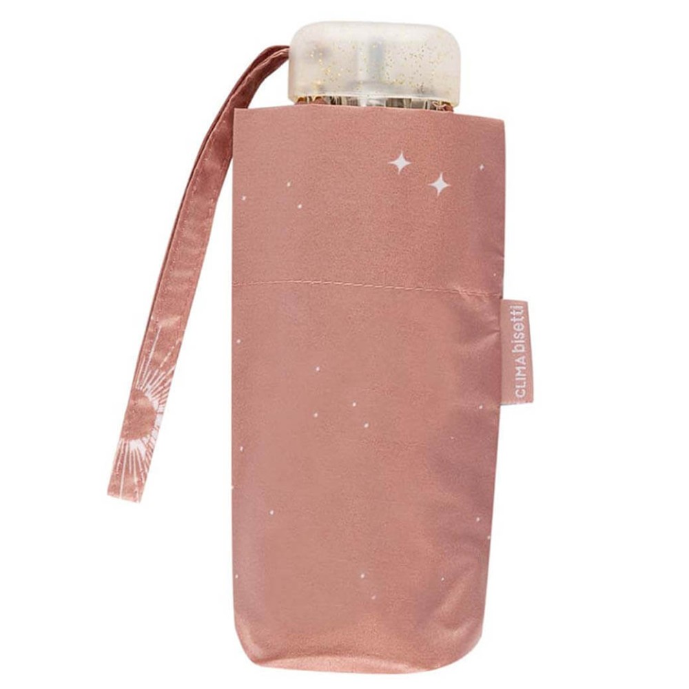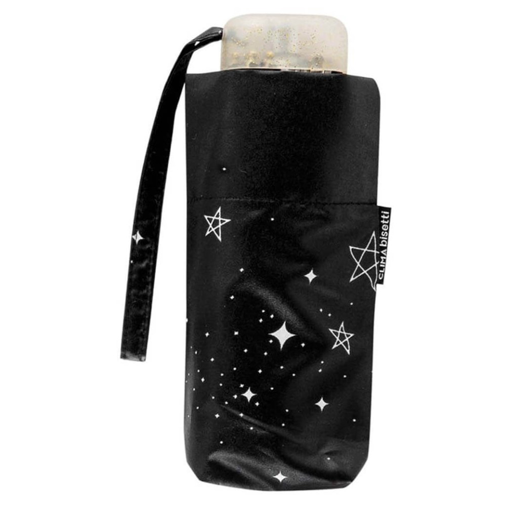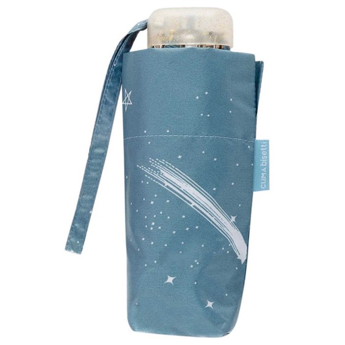 Un paraguas extraplano con un bonito estampado del universo sobre fondo rosa, azul o negro, perfecto para transportarlo en el bolso gracias a su formato compacto de 18 cm de longitud, además, la empuñadura reciclable semi transparente con purpurina dorada lleva una práctica cinta para poder colgarlo si se desea.