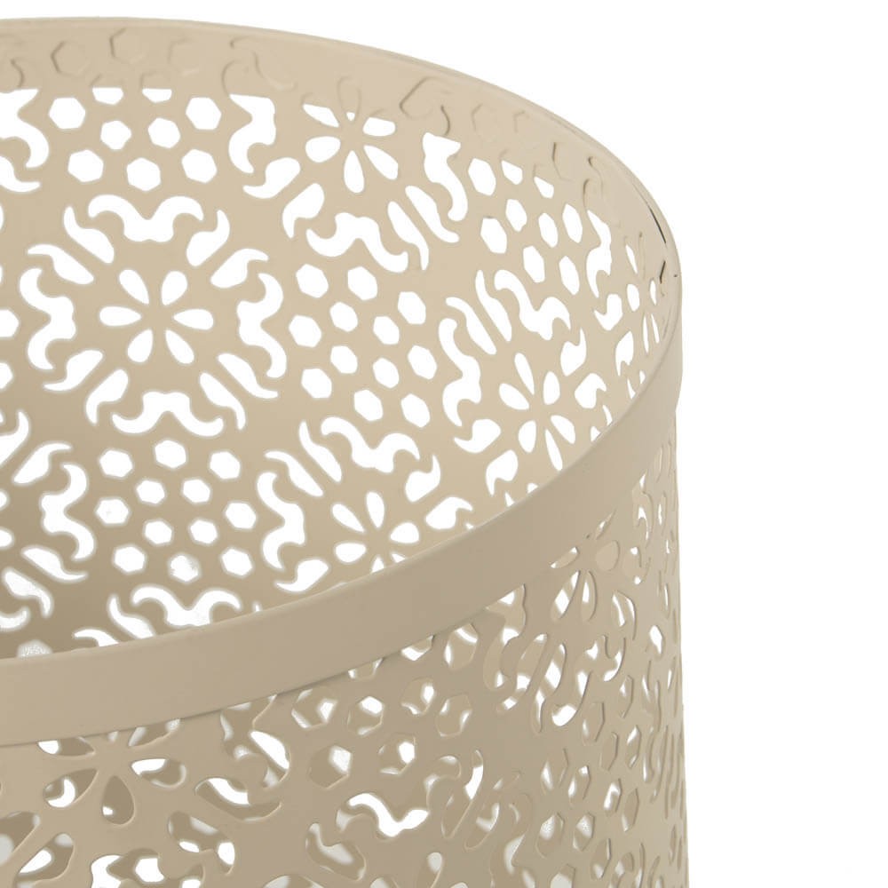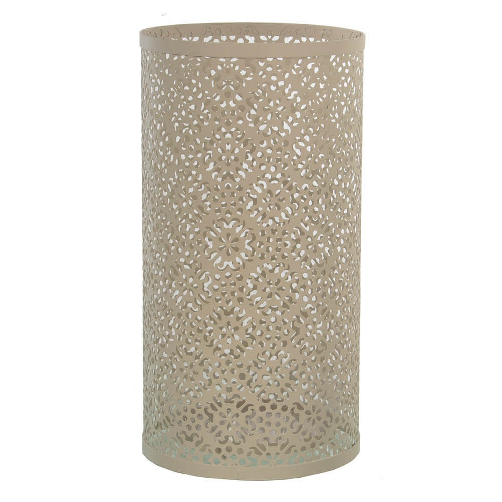 Paragüero redondo de color blanco realizado en metal calado creando un maravilloso dibujo de estilo clásico. Un accesorio funcional y decorativo, un paragüero original super práctico para situarlo en la entrada de la casa u oficina.