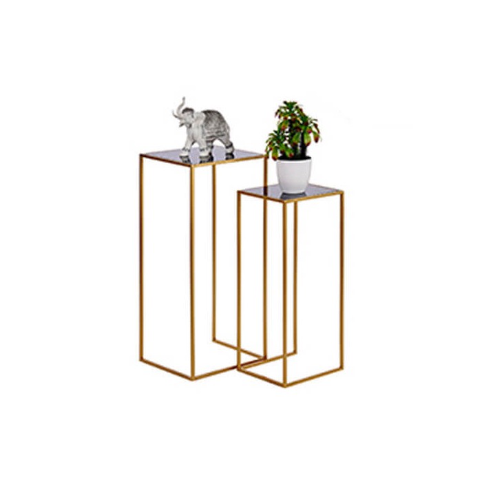 Conjunto de 2 pedestales para plantas con base cuadrada, superficie de cristal negro y estructura metálica dorada.