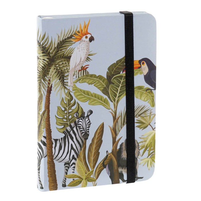 Libreta A6 con tapas decoradas con animales y plantas de la selva.