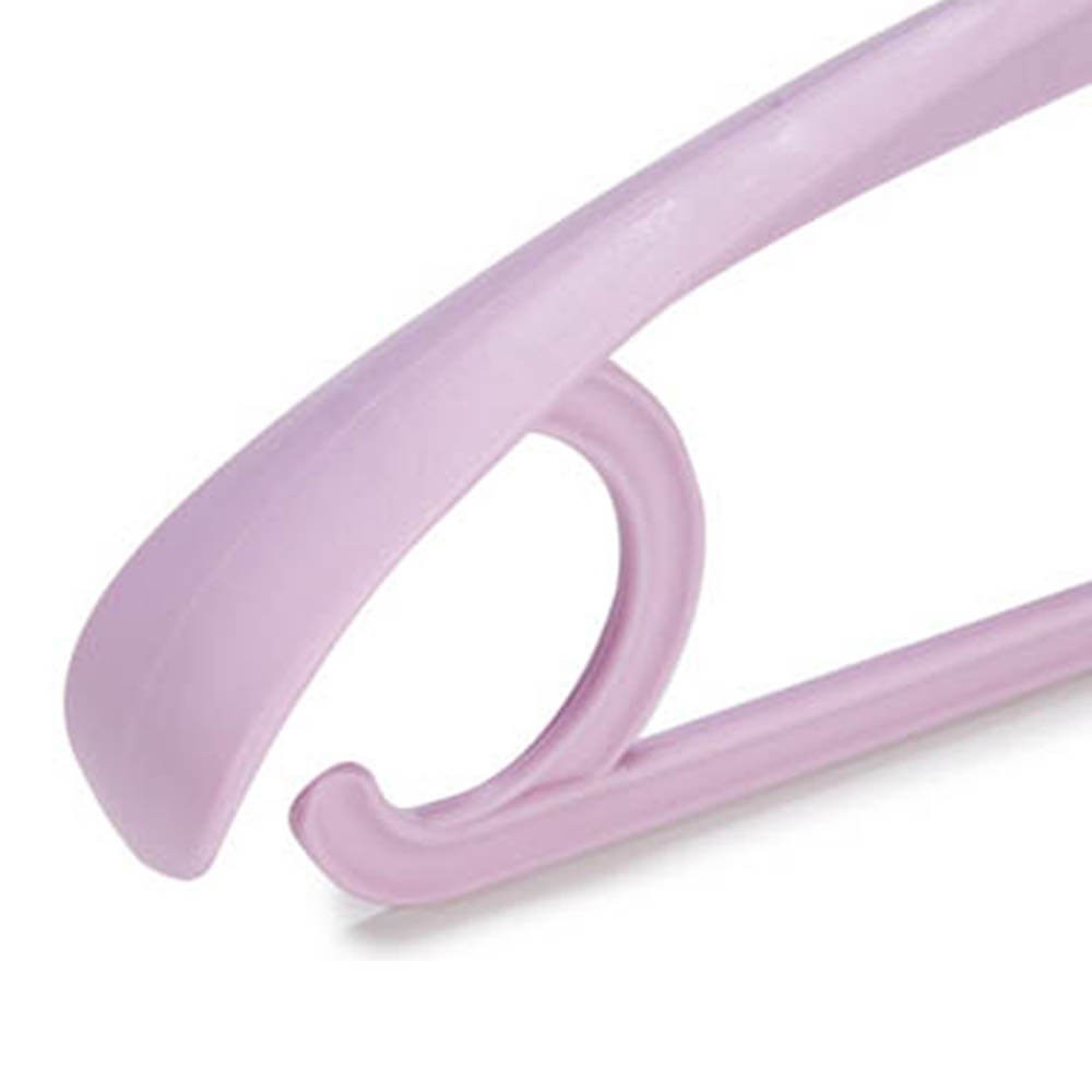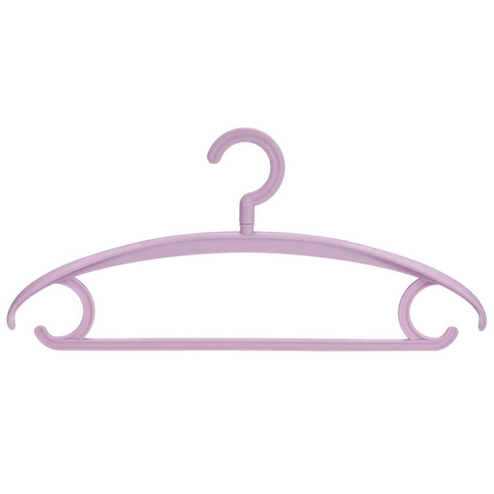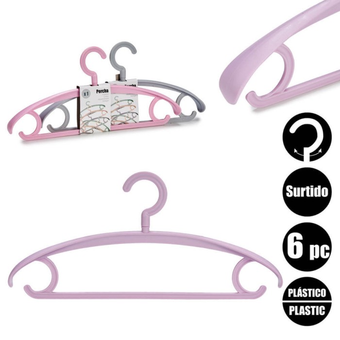Percha para ropa en plástico de color rosa, lila o gris con gancho giratorio y forma arqueada.