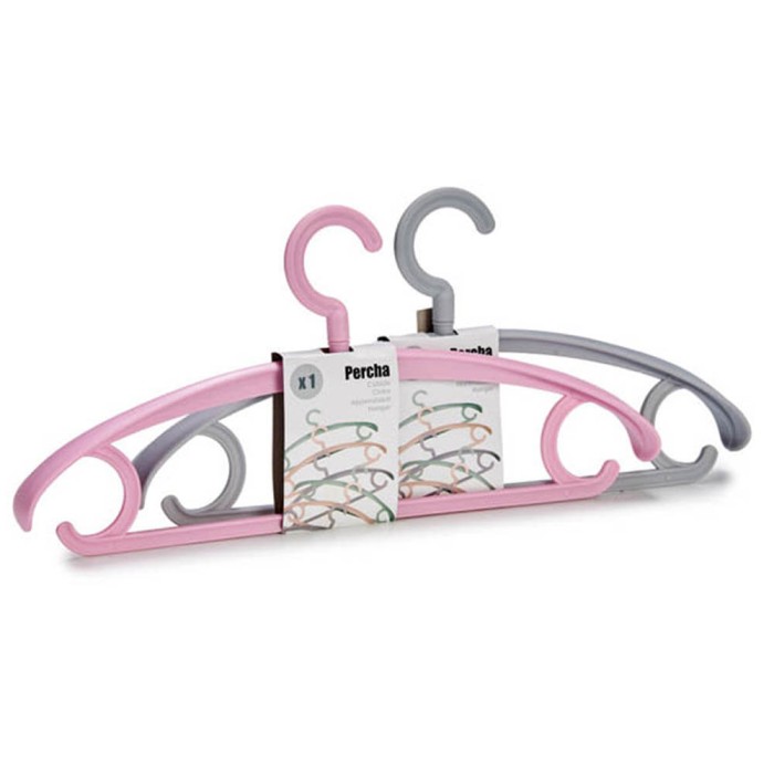 Percha para ropa realizada en plástico resistente de color rosa, lila o gris con gancho giratorio y forma arqueada. Dispone de barra para colgar pantalones, ganchos para faldas o vestidos y extremos ligeramente más anchos y curvados para no marcar la ropa y evitar que se arrugue.