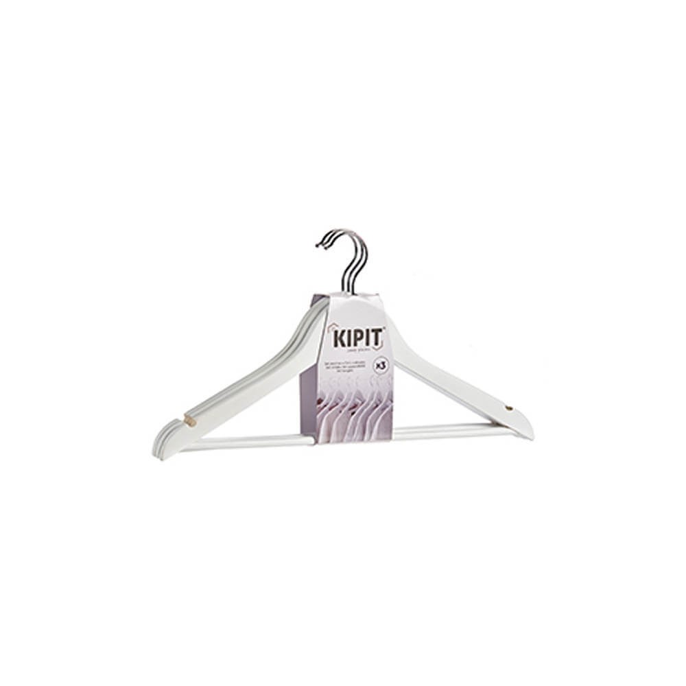 Conjunto de tres perchas para ropa realizadas en madera pintada de blanco con hendiduras para colocar prendas de tirantes y barra para pantalones.